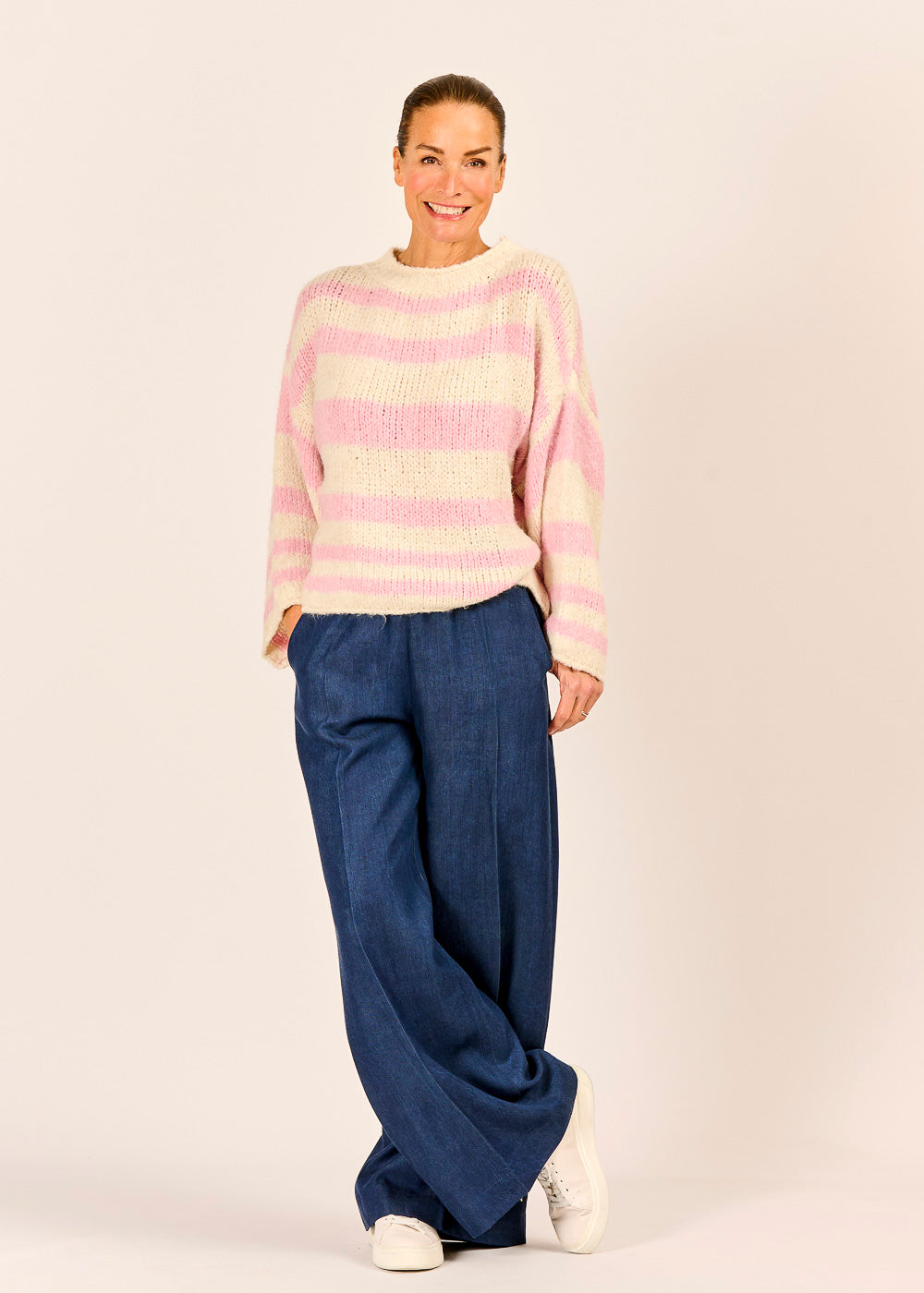 Dieser kuschelige Streifenpullover ist ein charmantes Statement-Piece, das mit einer harmonischen Farbkombination aus hellem Beige (oder Creme) und zartem Rosa besticht. Der grobe Strick und der lockere Schnitt sorgen für ein wunderbar weiches und komfortables Tragegefühl. Ein perfektes Basic, das lässige Denim-Looks sofort mit einem Hauch von Frische und Verspieltheit belebt.