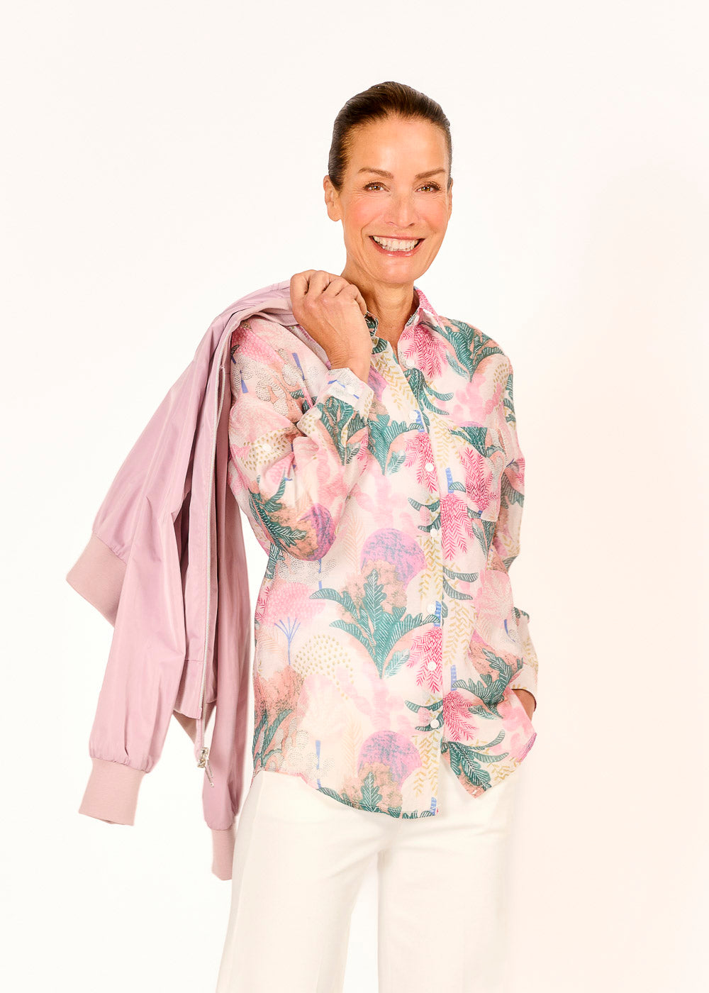 Diese Hemdbluse begeistert mit einem zarten Muster in sanften Rosatönen und verleiht jedem Look eine feminine Leichtigkeit. Der schmale Kragen unterstreicht das elegante Design, während das leichte Material für ein angenehmes Tragegefühl sorgt. Ob im Büro oder in der Freizeit – diese Bluse ist ein stilvoller Allrounder.