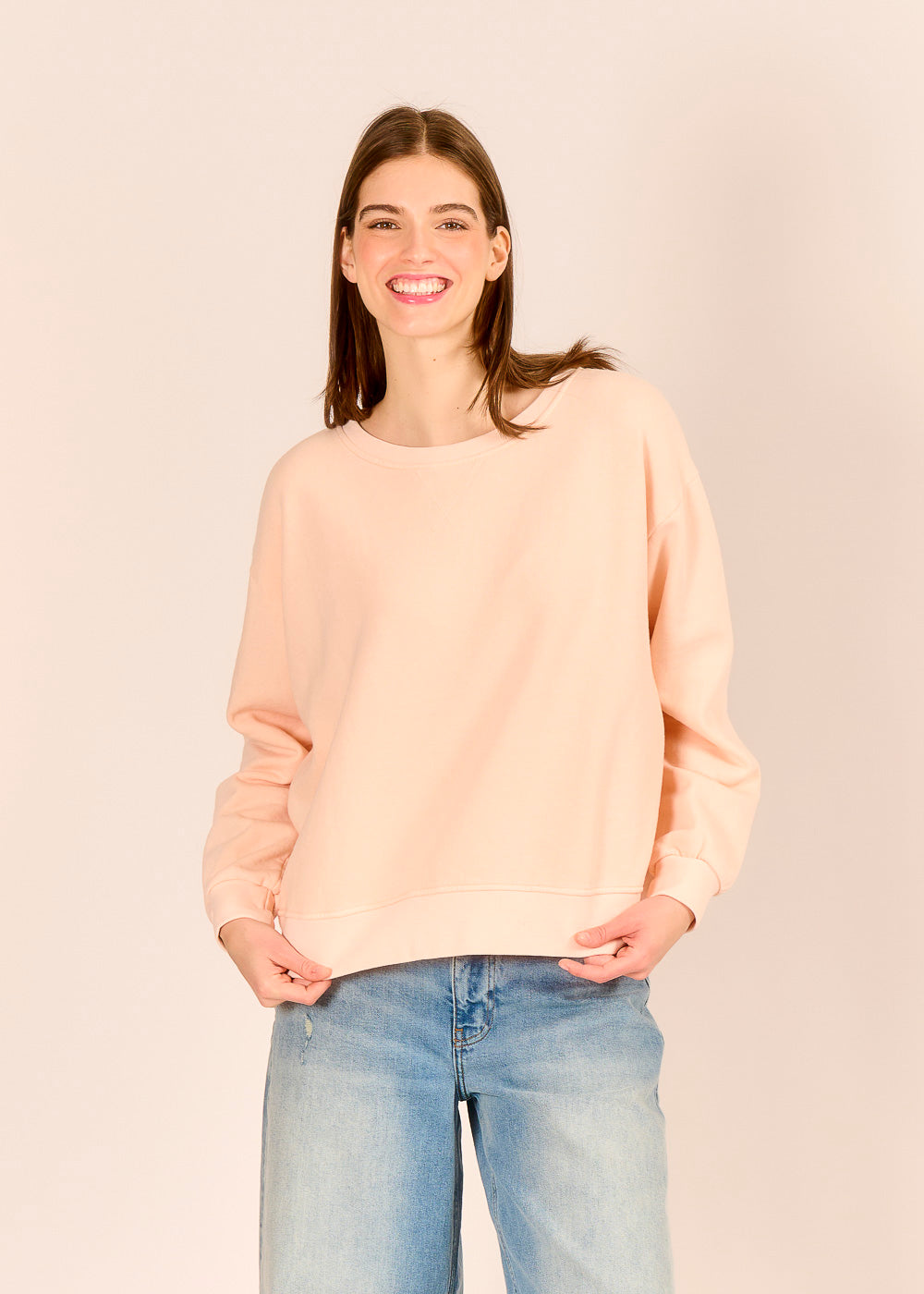 Das lässige Sweatshirt fühlt sich auf der Haut unglaublich soft an und begleitet dich entspannt durch den Alltag. Der zarte Farbton erinnert an Pfirsiche auf einem Markt in der Toskana und verleiht deinem Look eine feminine Leichtigkeit.