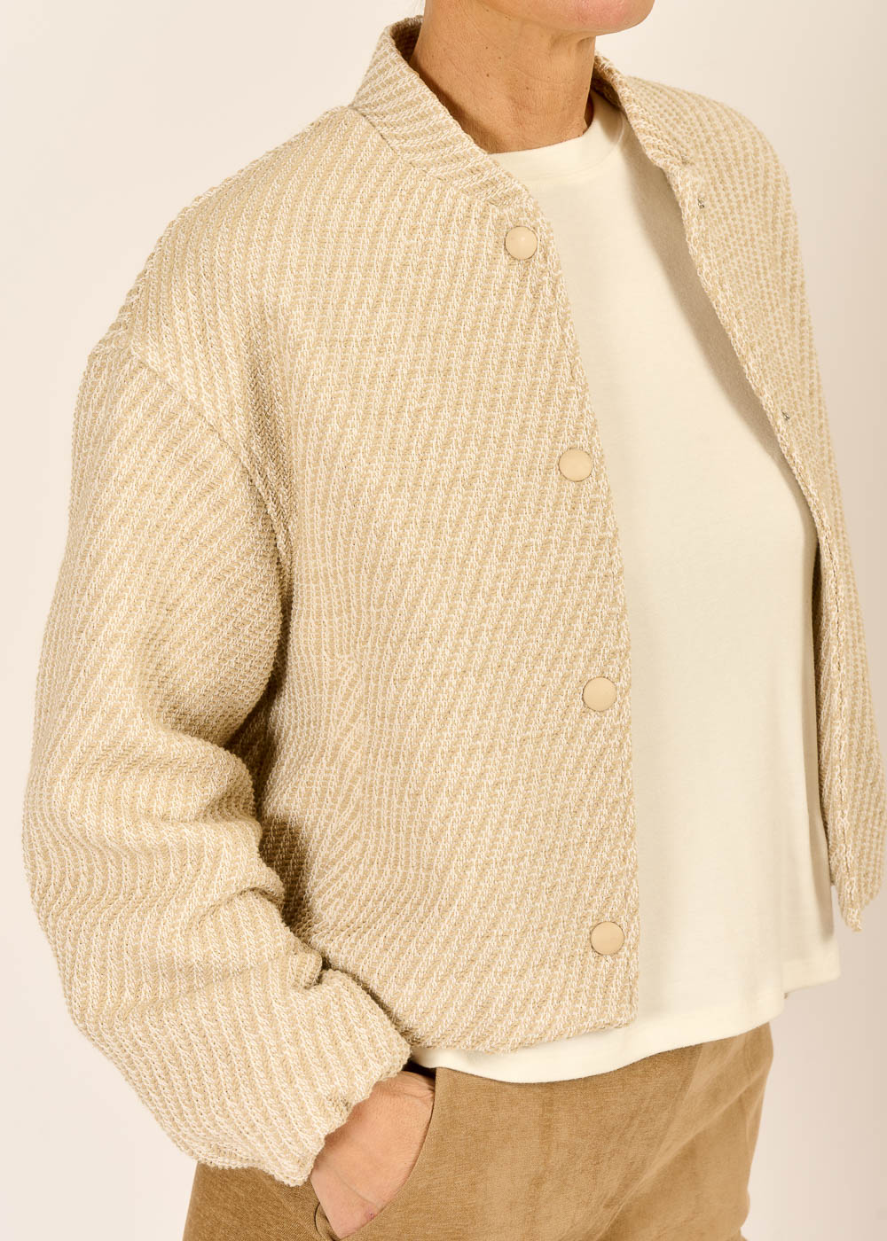 Der modern geschnittene Bomberino ist inspiriert vom urbanen Style Mailands, wobei sportliches Design und zeitloser Stil ganz selbstverständlich miteinander verschmelzen. Der edle Strukturstoff verleiht Charakter, während der warme Beigeton zeitlose Ruhe ausstrahlt. Praktische Druckknöpfe machen den Bomberino zum unkomplizierten Begleiter.
