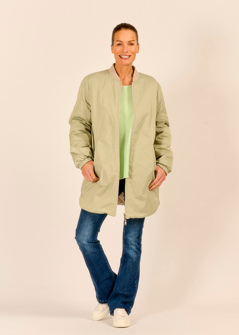 Der Wendebomberino sorgt durch den langen Schnitt für maximalen Komfort in der kühlen Übergangszeit. Dank seines cleveren Wendekonzepts lassen sich unterschiedliche Looks stylen. Die Farbe Pictacchio verleiht deinem Look Frische, die gesteppte Seite strahlt Ruhe und Gelassenheit aus.