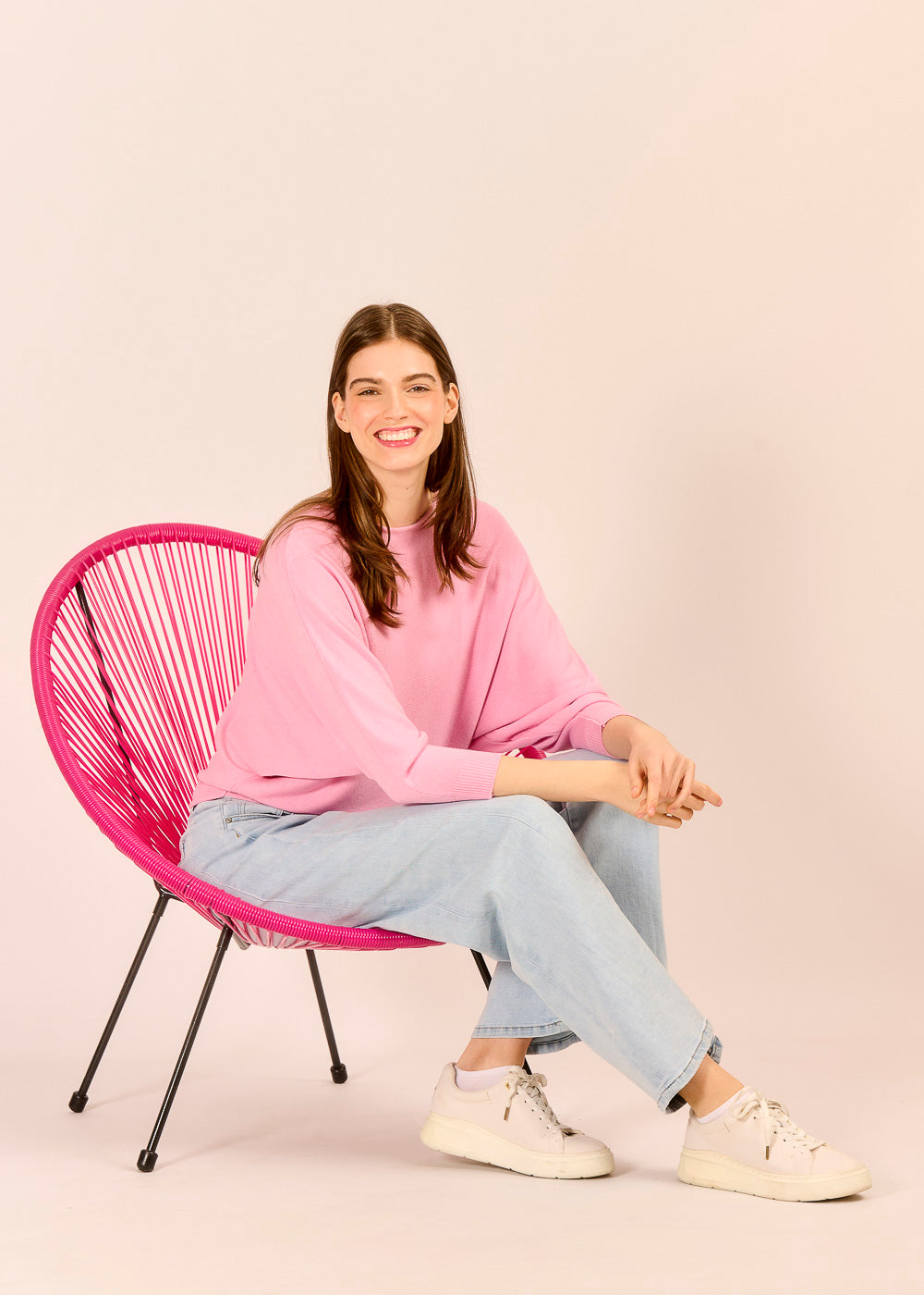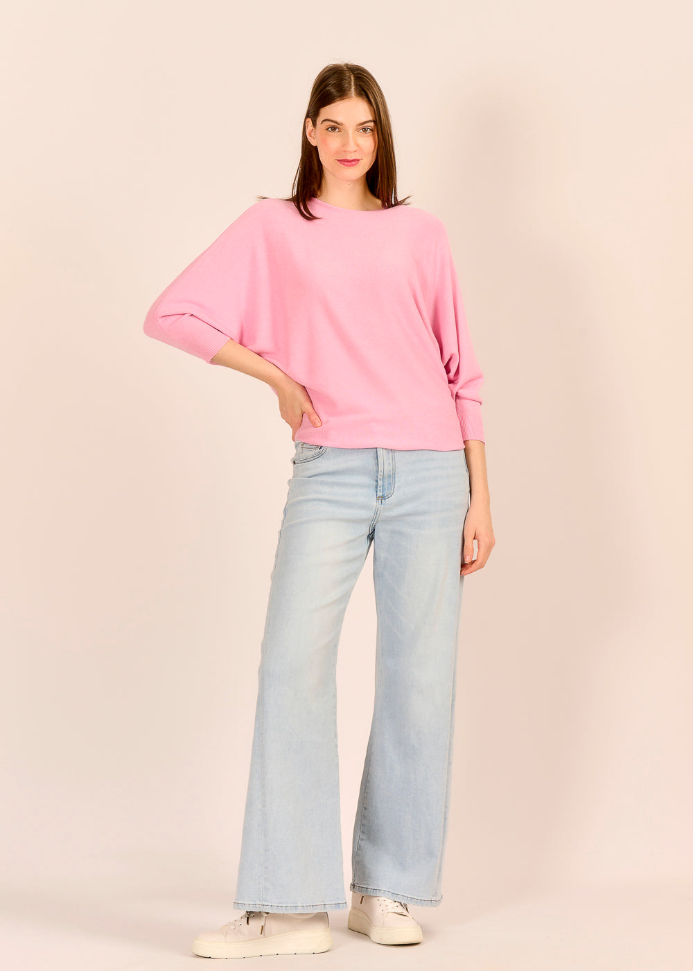 Der rosafarbene Fledermauspullover mit 3/4-Arm ist ein echtes Lieblingsstück, das Frische und italienische Lebensfreude ausstrahlt. Der lässige Schnitt umspielt deinen Körper und verleiht deinem Outfit eine Balance aus Komfort und Stil.