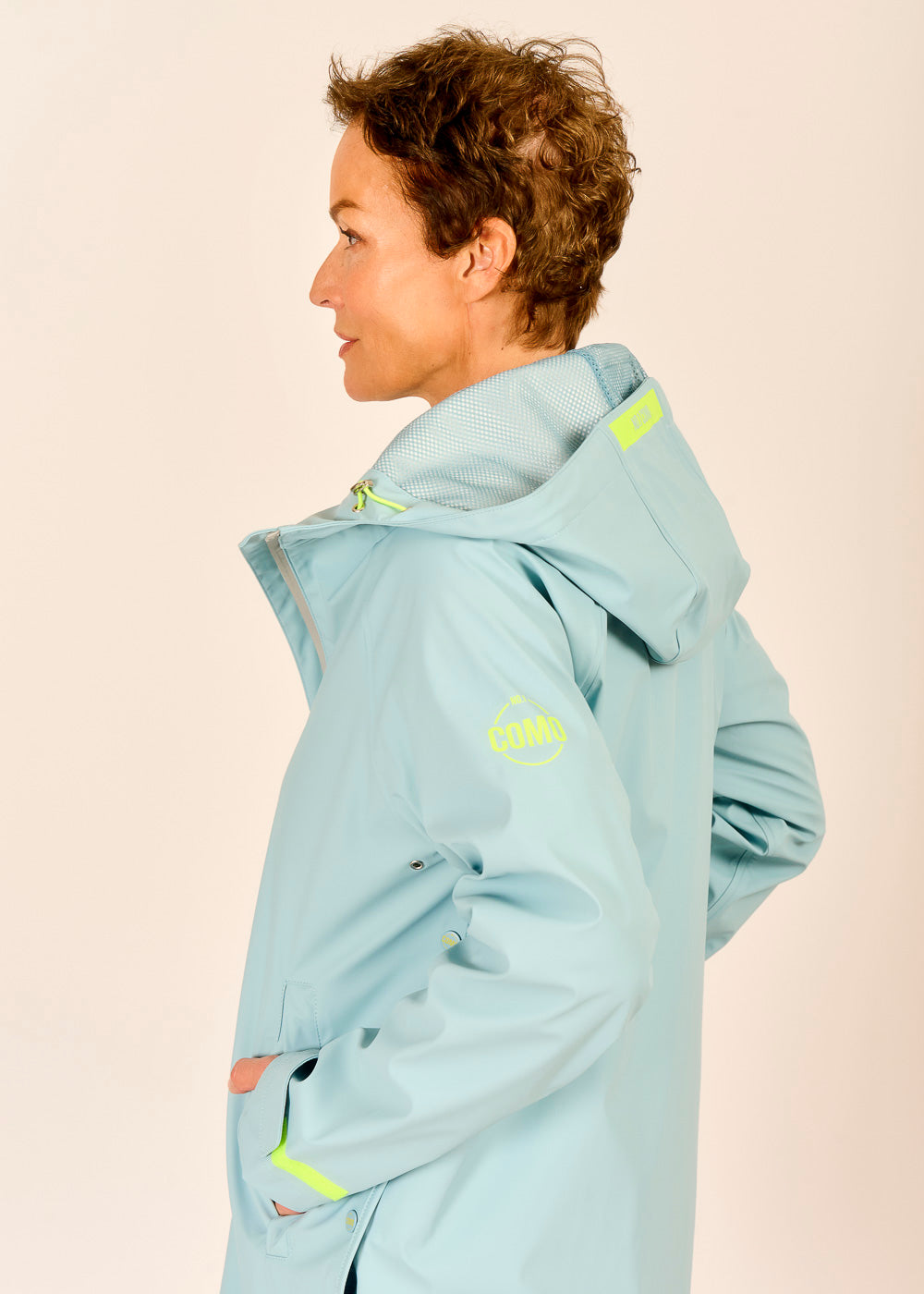 Der himmelblaue Regenmantel von COMO No. 1 ist ein stilvoller Begleiter für graue Regentage. Die Kapuze schützt zuverlässig vor Wind und Wetter, während farbige Akzente dem Mantel eine fröhliche Note verleihen. Verstellbare Elemente sorgen für perfekten Sitz und zusätzlichen Komfort.