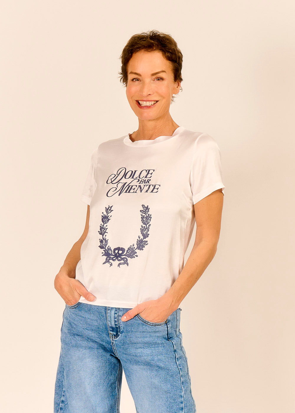 Das weiße Shirt verbindet modernen Minimalismus mit mediterranem Flair. Der Aufdruck „Dolce far niente“ bedeutet so viel wie süßes Nichtstun und macht das Shirt zu einem charmanten Fashion-Statement mit Augenzwinkern und volle sommerlicher Leichtigkeit. Weiche Viskose sorgt für ein besonders angenehmes Tragegefühl und eine locker fallende Silhouette.