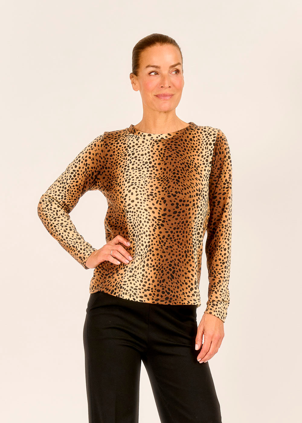 Dieses Animalshirt in der warmen Trendfarbe Caramello bringt wilde Eleganz und lässige Coolness in jeden Look. Das markante Animal-Print-Design trifft auf weichen Stoff, der sich angenehm an deine Haut schmiegt. Ob zu Jeans, Rock oder Lederjacke – dieses Shirt setzt ein modisches Statement, ohne auf Komfort zu verzichten. Perfekt für alle, die ihren Alltagsoutfits einen Hauch Abenteuer verleihen wollen.