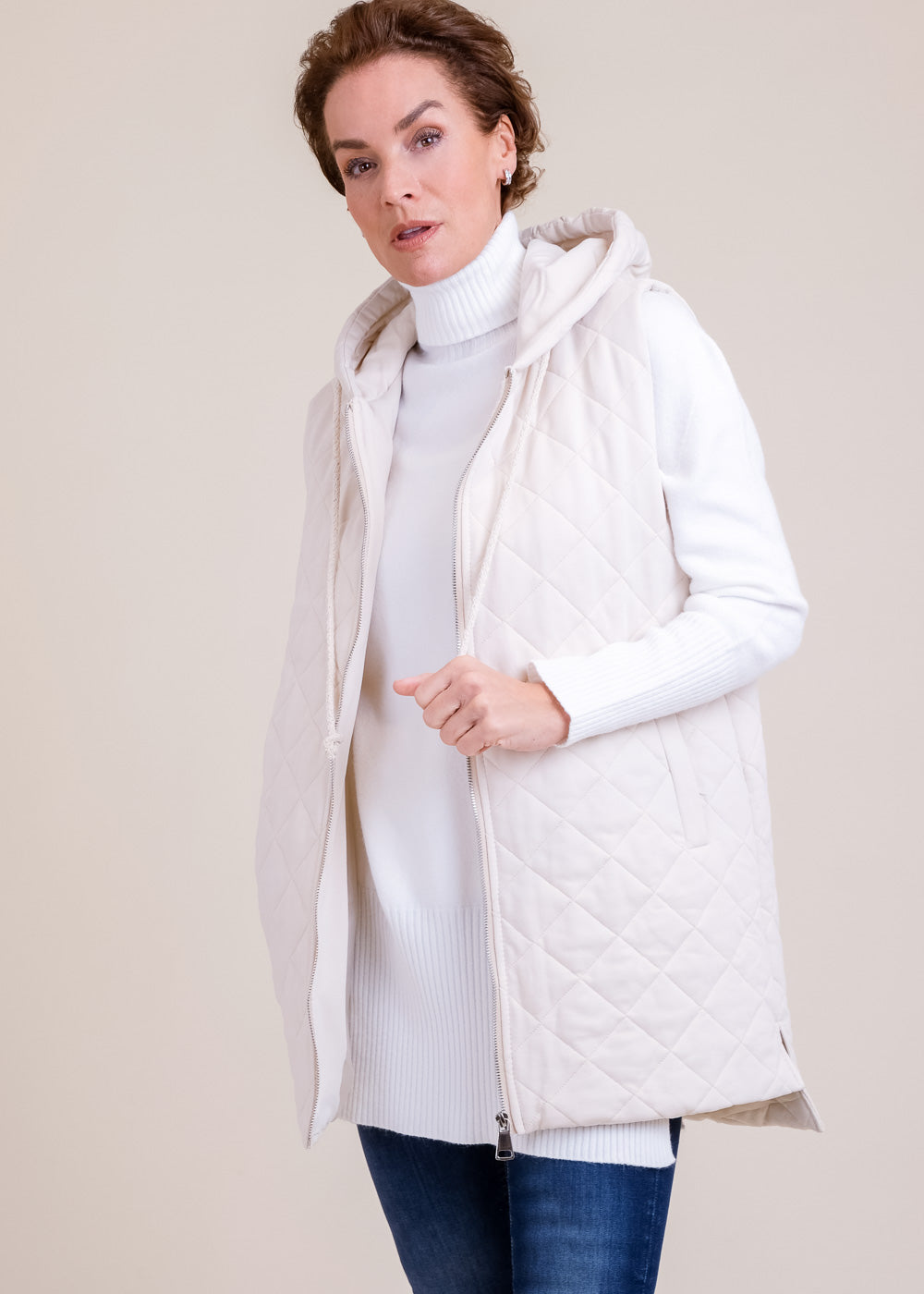 Angesagte, leichte Steppweste mit kleinen Seitenschlitzen. Vorne länger geschnitten als hinten. Seitliche Eingriffstaschen und einer Kapuze, die mit einem Kordelzug kombiniert ist, rundet den coolen lässigen Look ab. Der perfekte Begleiter für das Frühjahr. Länge:80cm.