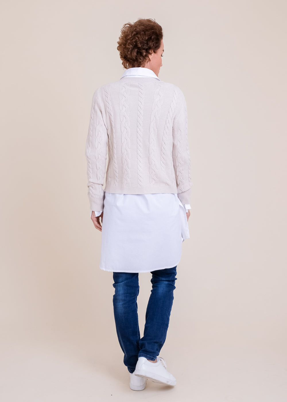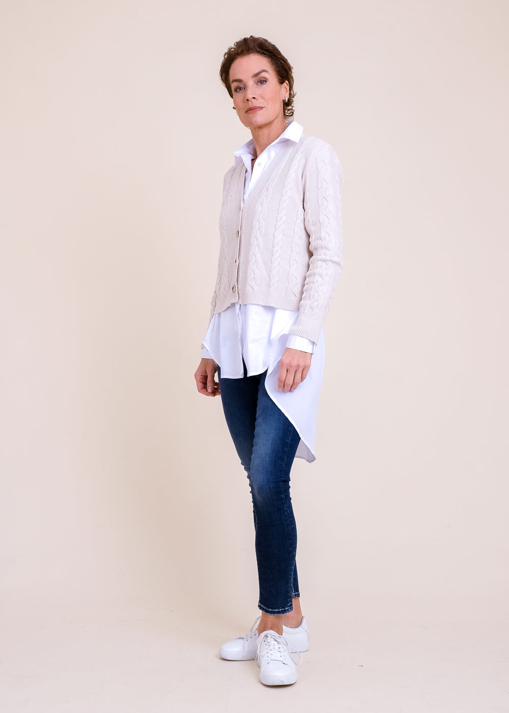 Kuschelig, weicher V-Ausschnitt Cardigan mit Zopfmuster. Die langen Ärmel schließen, wie auch der Saumabschluss, mit einem Rippenbündchen ab. Ein absoluter Hingucker.