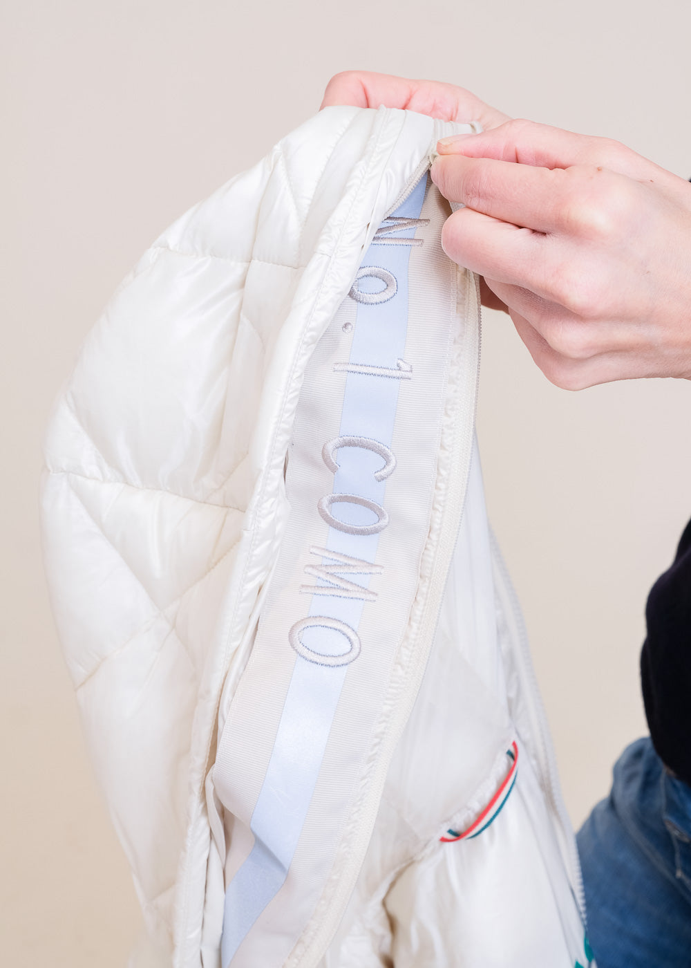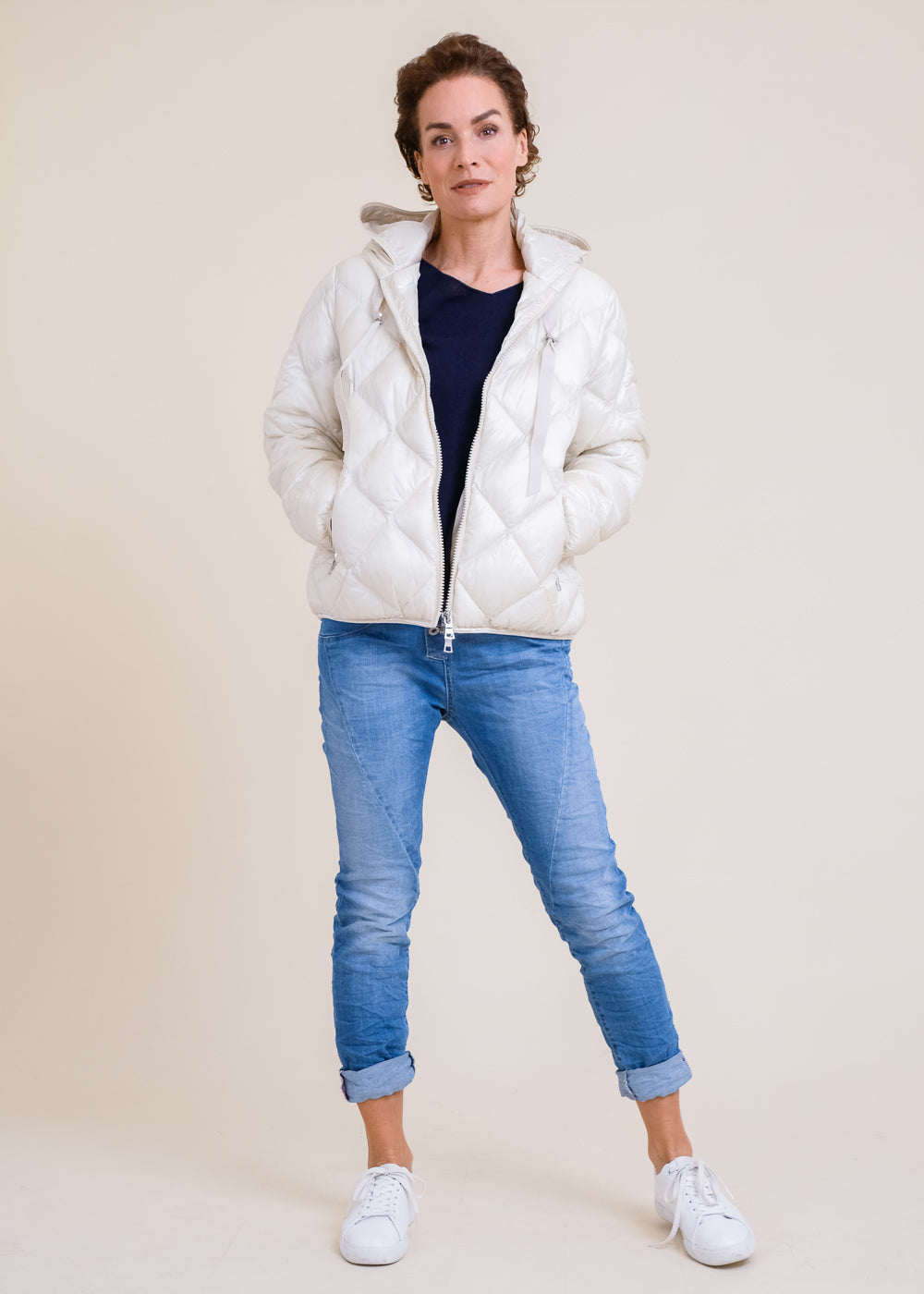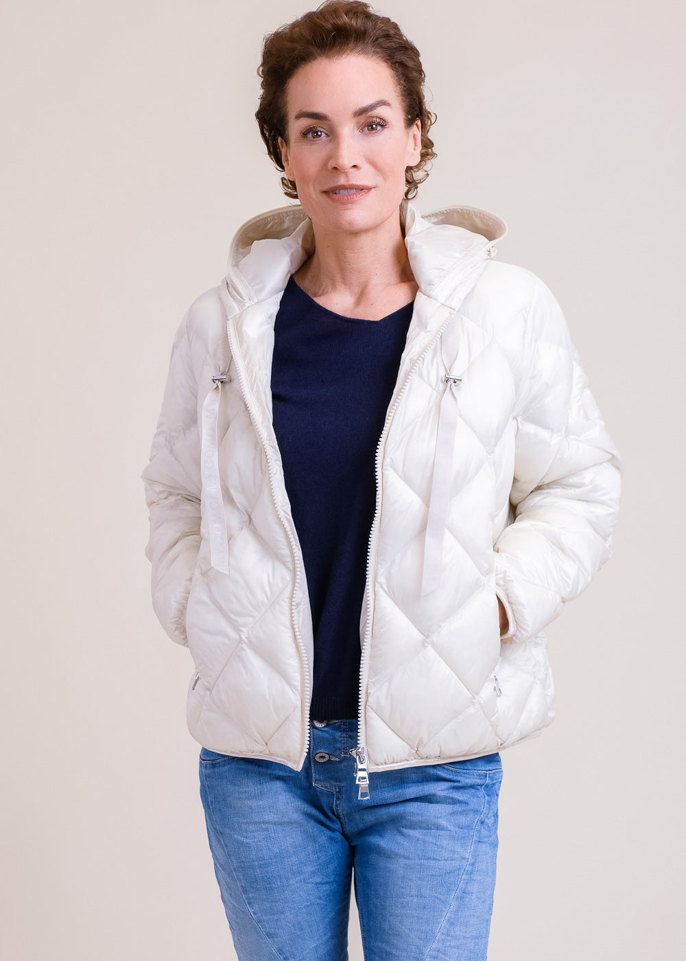 Wasserabweisende Steppjacke von No. 1 Como mit Diamantsteppung. Sie hat einen geraden Schnitt und einen Kapuzenkragen. Schießbar mit einem Zwei-Wege-Reißverschluss und seitlichen Reißverschlusstaschen. Länge:65cm.