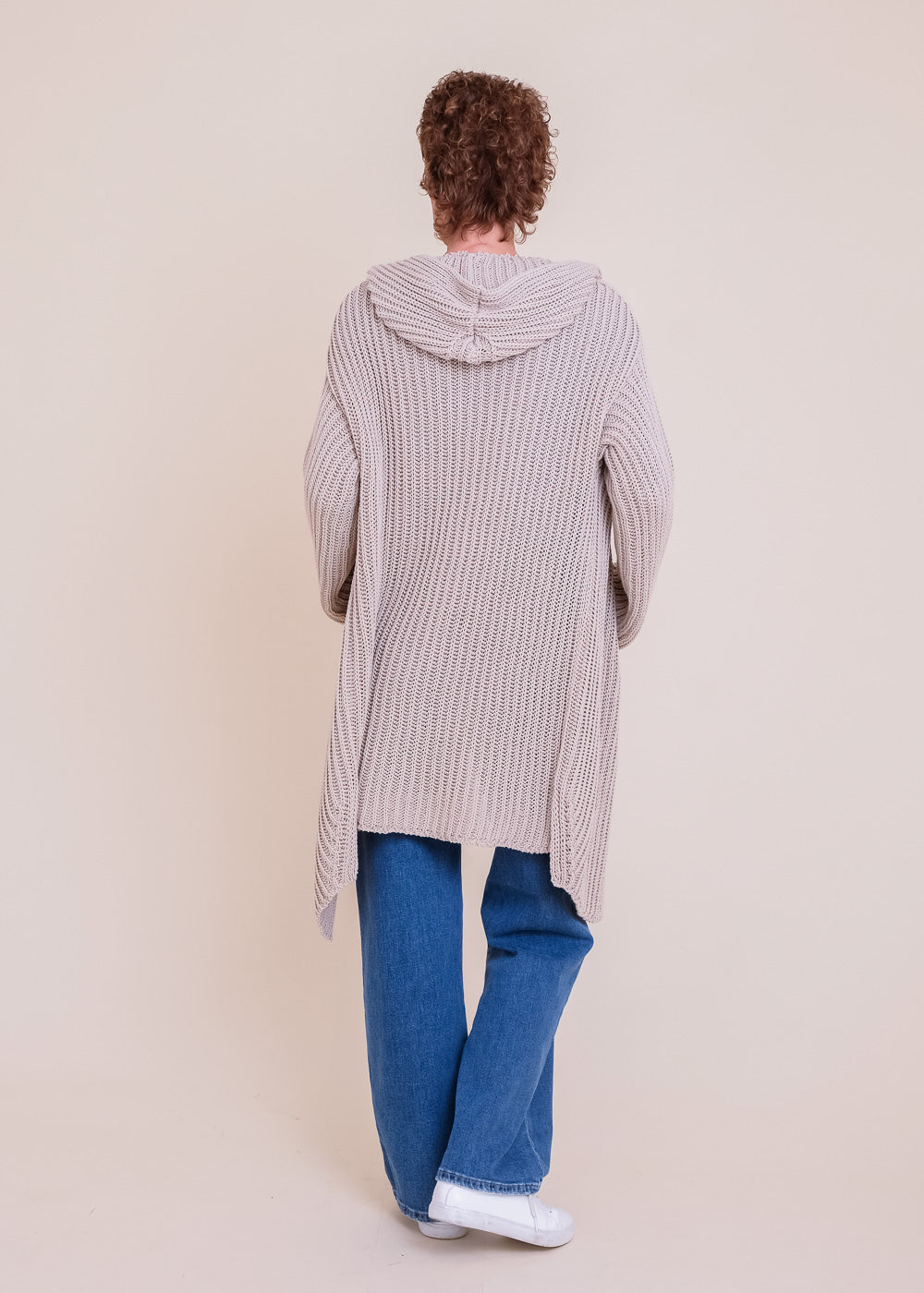 Lang geschnittene Grobstrickjacke aus reiner Baumwolle. Mit Kapuze und Druckknöpfen zum Schließen. Lässt sich großartig kombinieren. Länge:100cm.