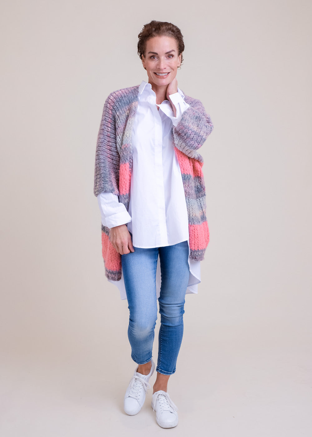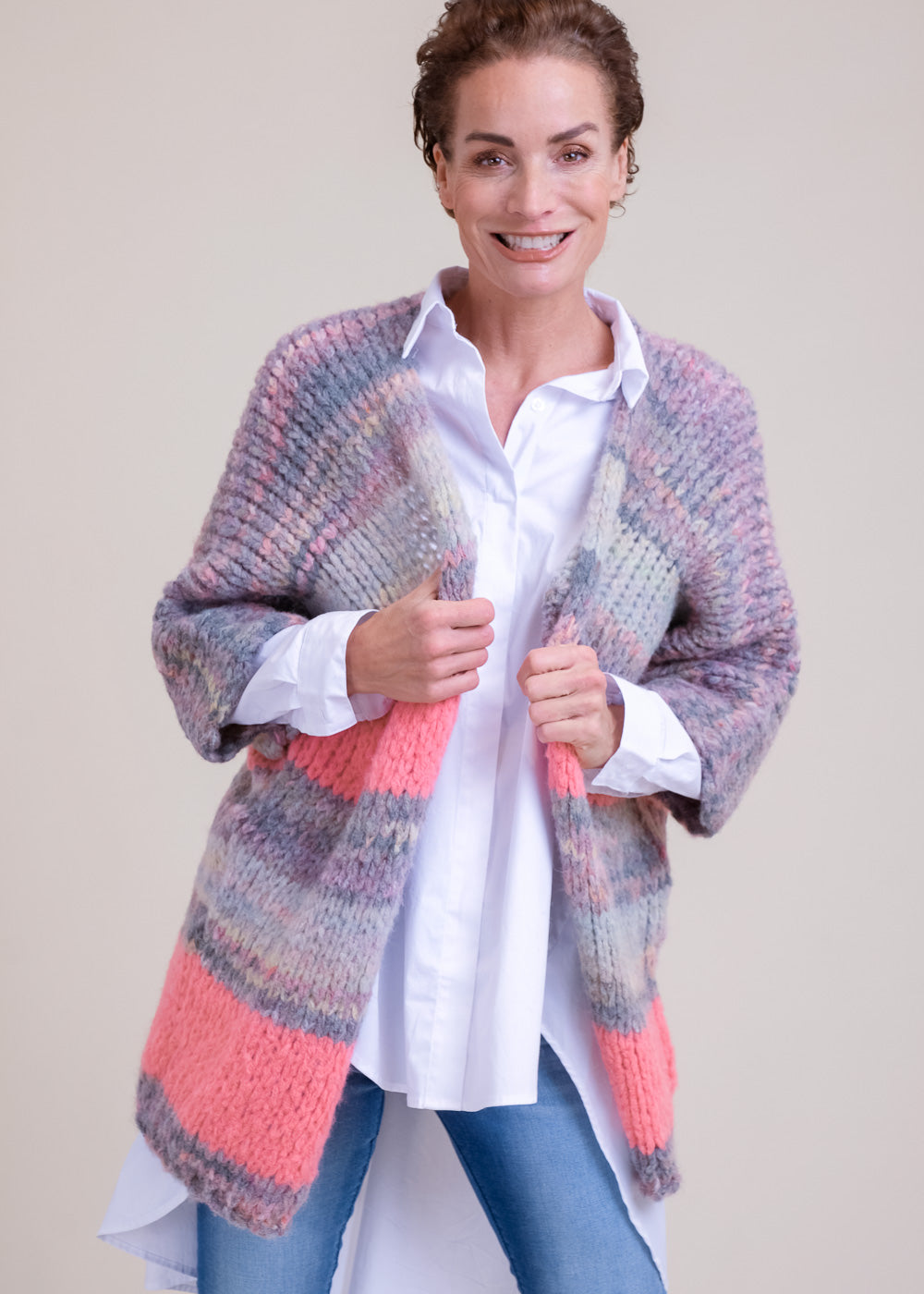 Diese lässige, offene Fashionstrickjacke mit ihrem besonderen Design passt perfekt zu hellen Oberteilen und Jeans. Sie hat einen dreiviertel Arm. Ein absoluter Trendsetter Artikel. Länge:76cm.
