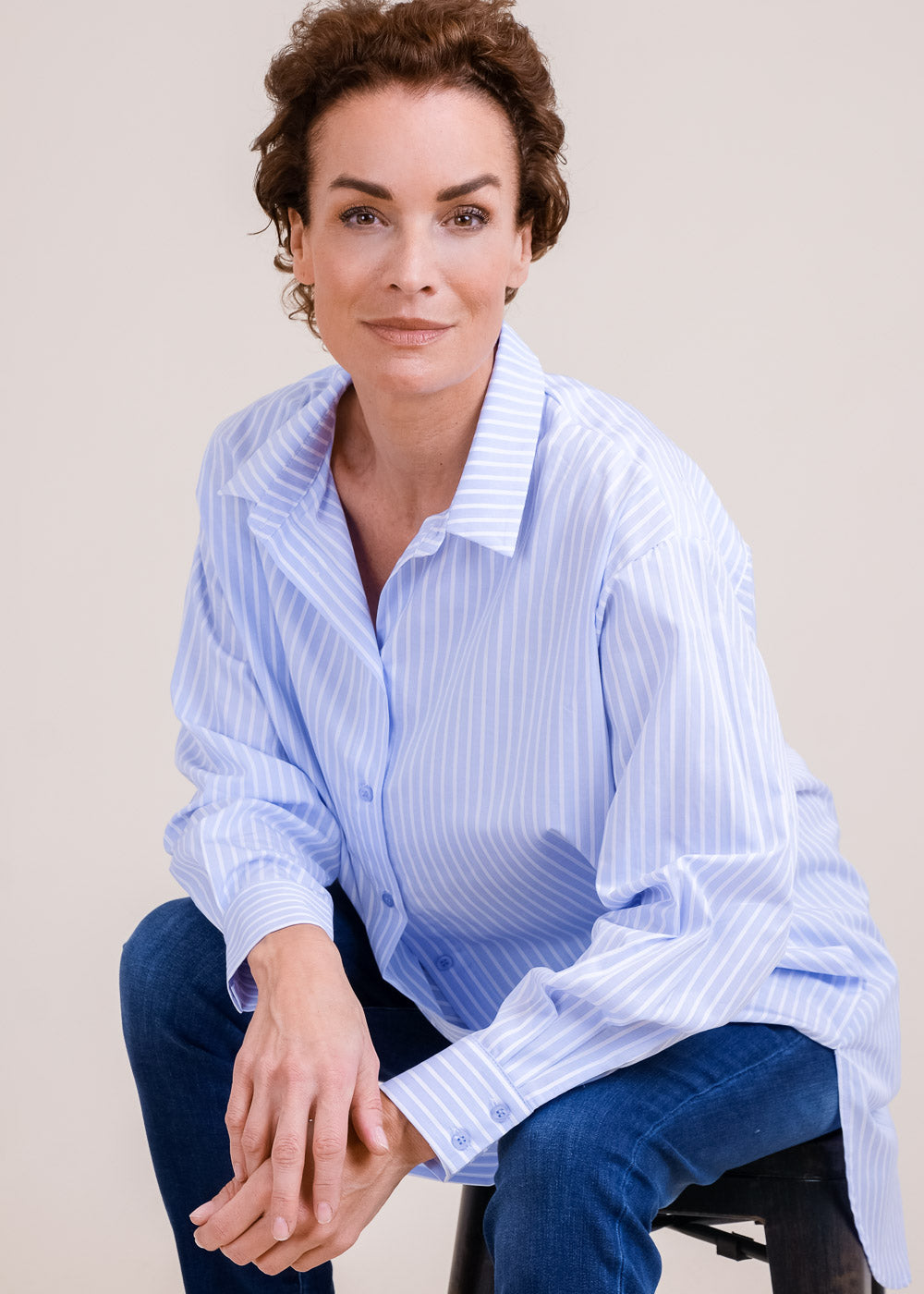 Oversized geschnittene Hemdbluse in Streifenoptik. Aus 100% Baumwolle mit überschnittenen Schultern. Abgerundetem Saum mit verlängertem Rückenteil. Perfekt mit Jeans und weißen Turnschuhen kombinierbar. Länge:74cm.