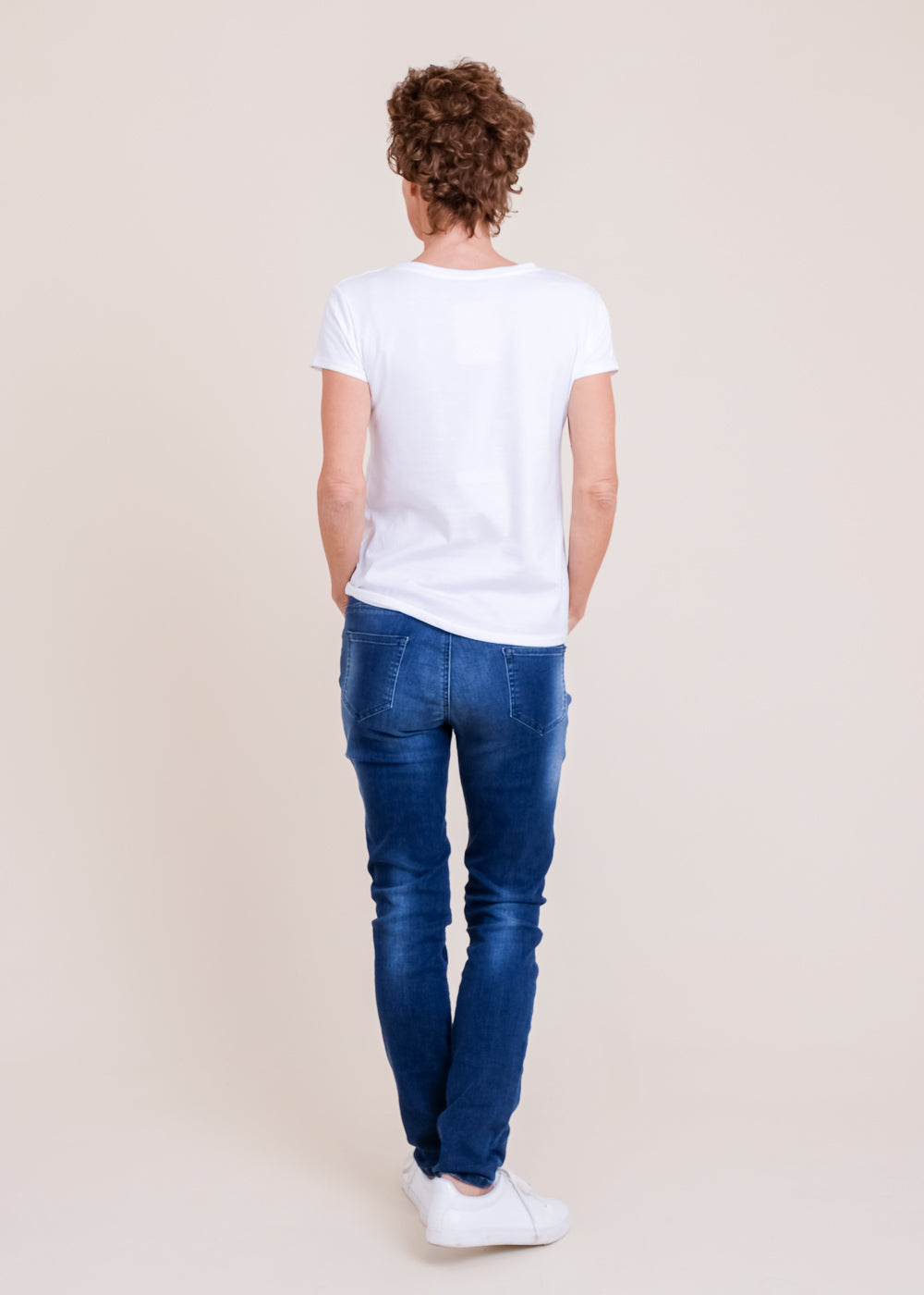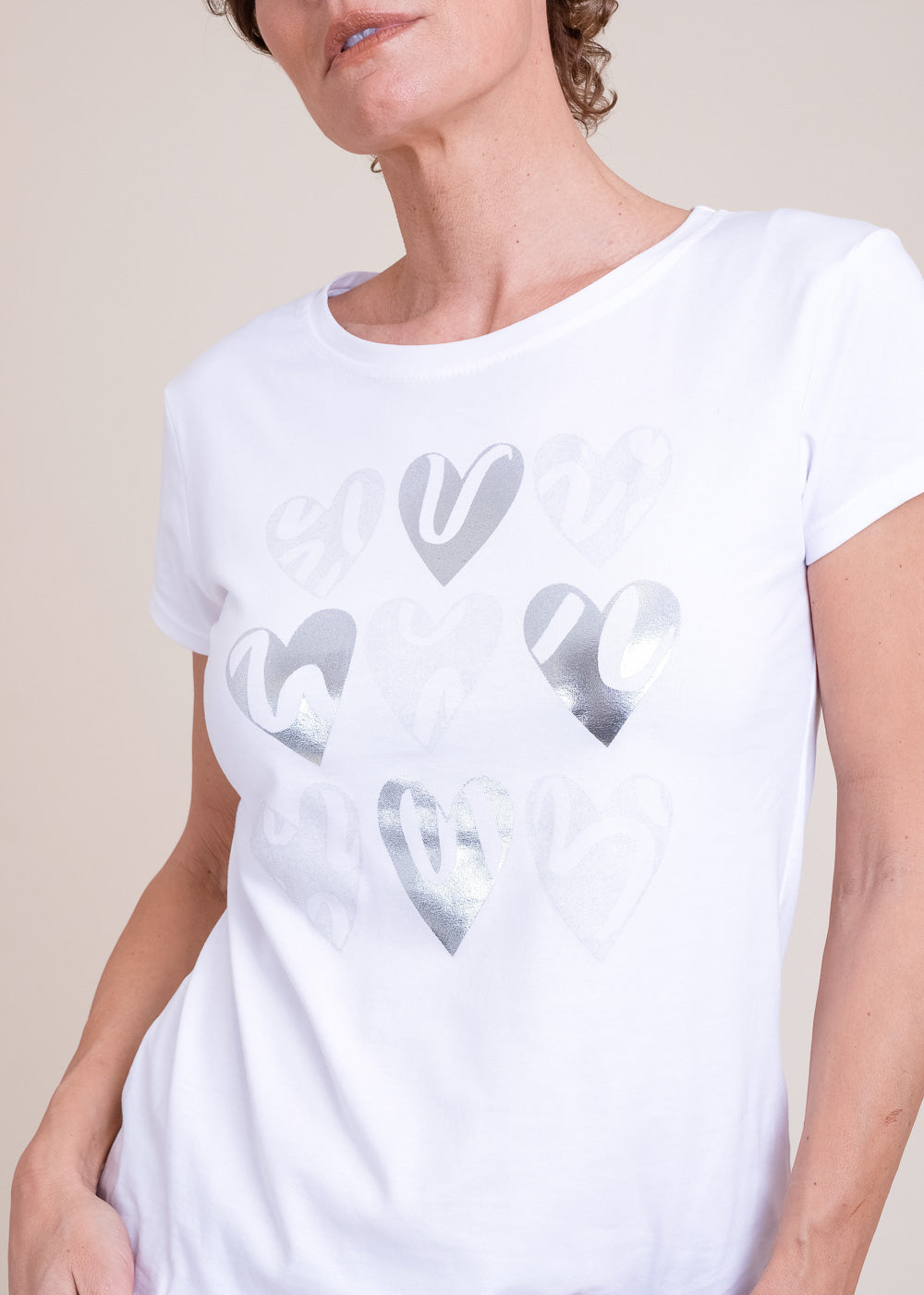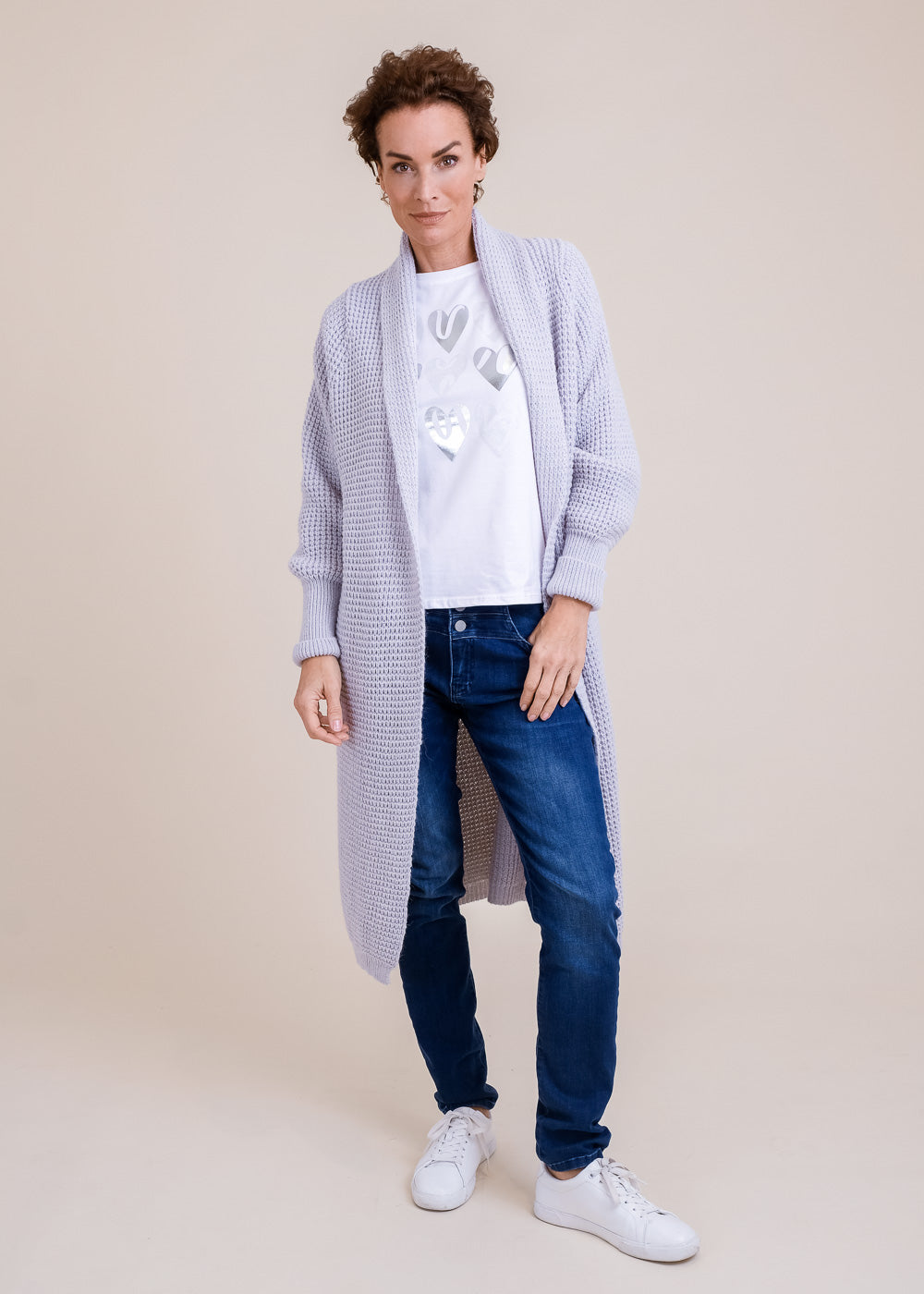 Klassisch geschnittenes T-Shirt aus weicher Baumwolle mit tollem Druck. Schmale Blende am Halsausschnitt. Perfekt kombinierbar mit unserer grauen langen Strickjacke und Jeans. Länge:62cm.