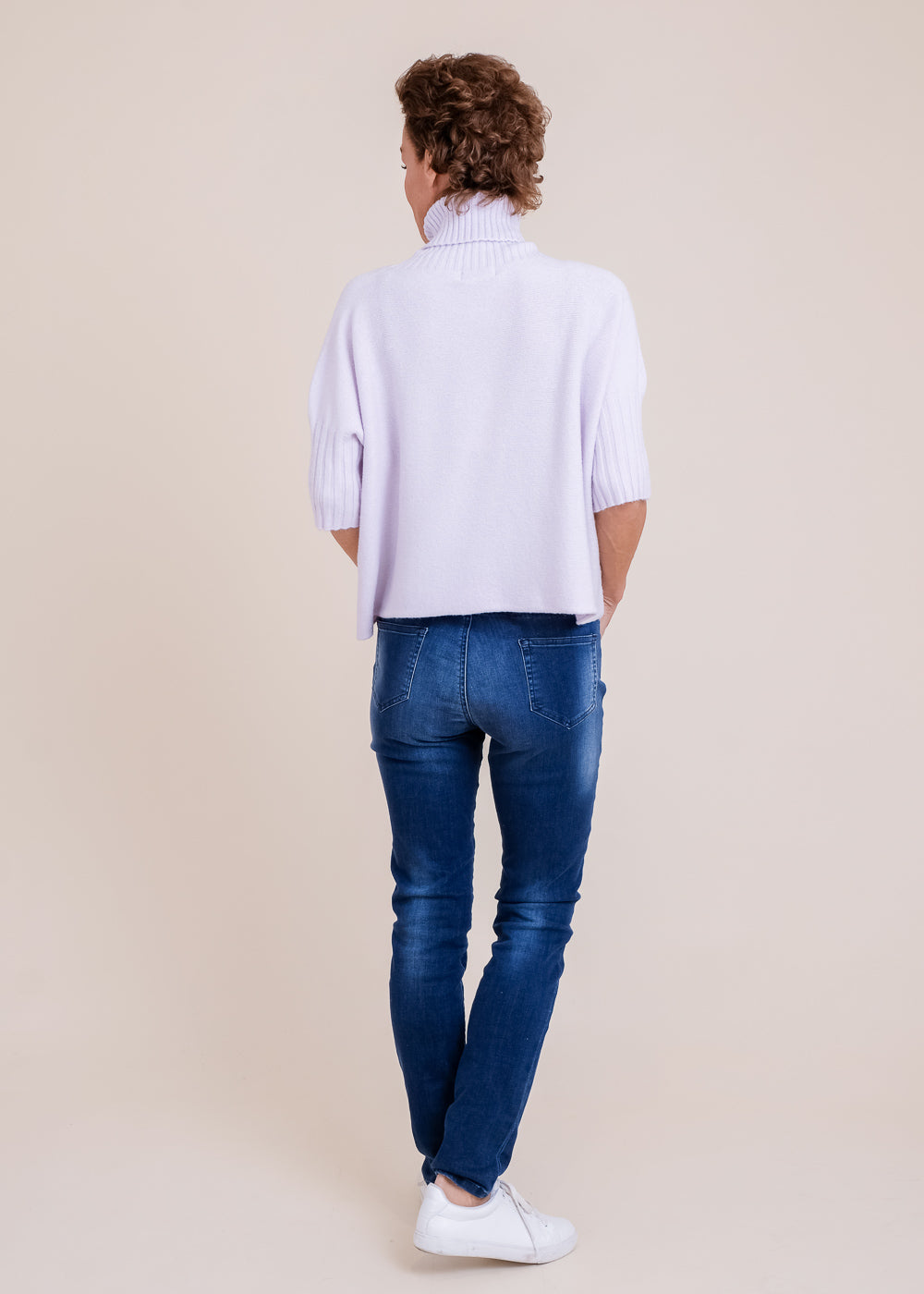 Kurz geschnittener Rollkragen Pullover mit halb Arm. Rippendesign an den Ärmeln sowie am Rollkragen. Aus unserem kuschelweichen Garn. Großartig kombinierbar mit einer höher geschnittenen Hose und einem Blazer. Länge:57cm.