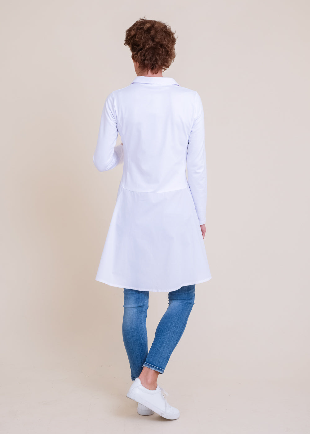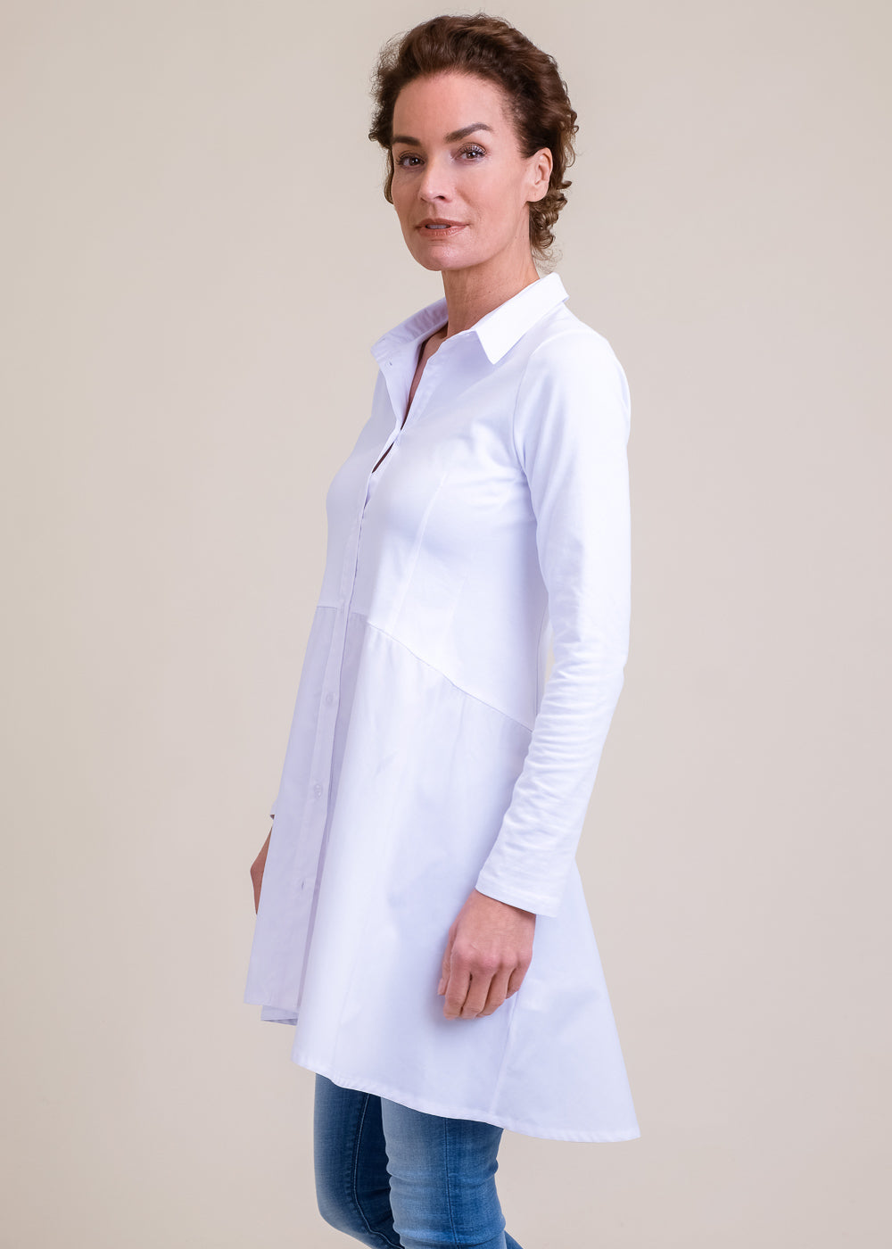 Länger geschnittene Bluse mit Hemdkragen und Knopfleiste. Das Design punktet mit der schönen A-Linie. Besonders gemütlich durch seinen Jersey Stoff im Arm Bereich und im Body Bereich. Hinten länger geschnitten als vorne. Länge:88cm.