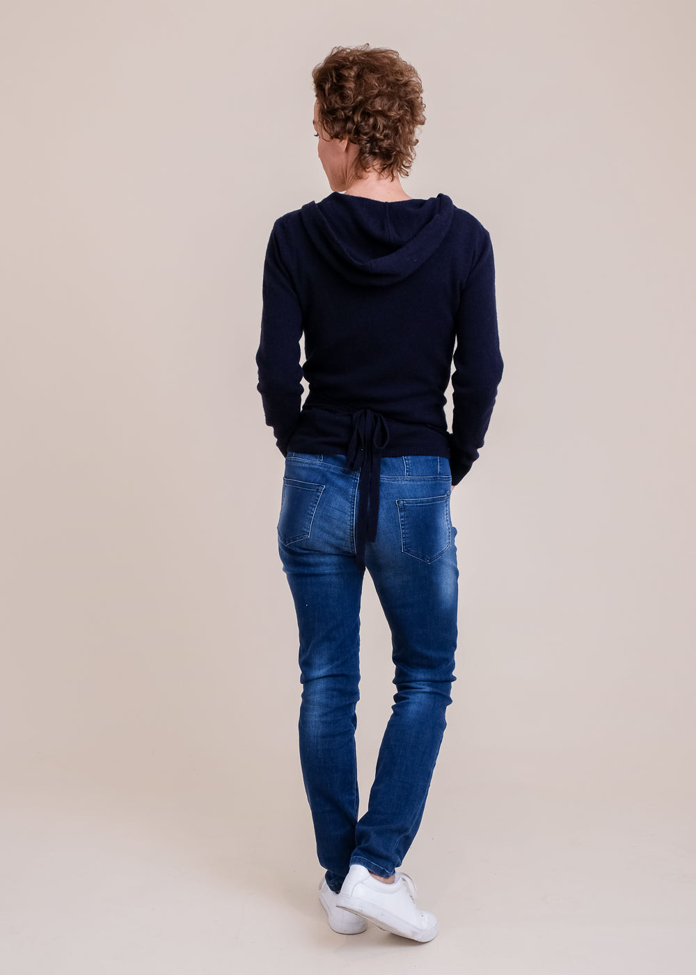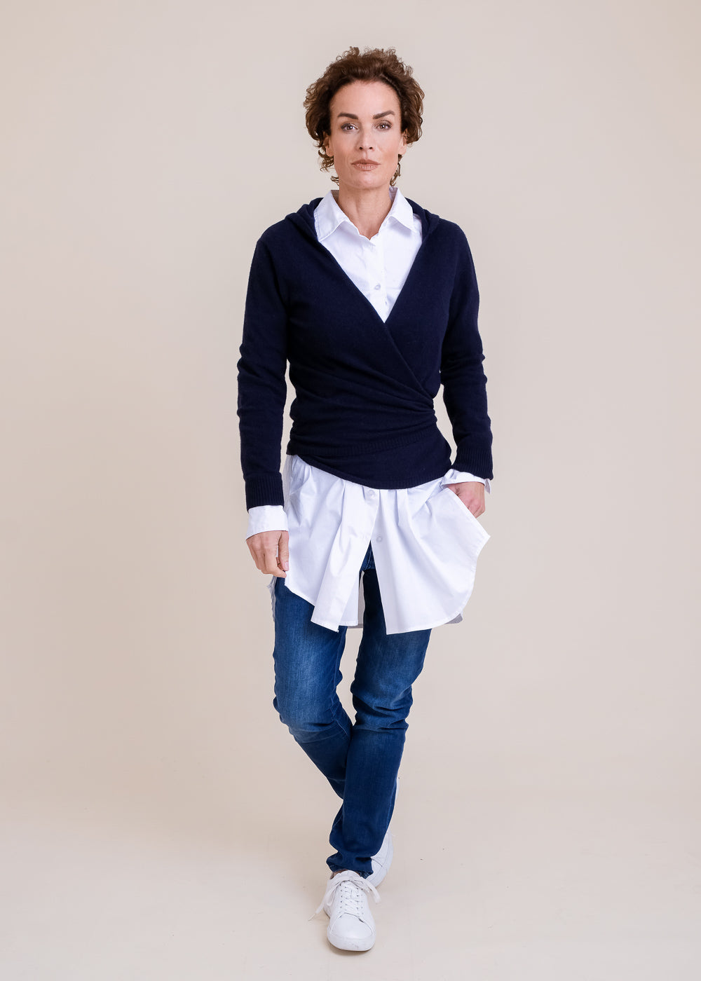 Unsere geliebte Wickelstrickjacke mit Kapuze. Rippenbündchen an den Ärmeln, sowie am Saum. Sie hat einen Figurbetonter Schnitt und Kaschmiranteil. Länge:58cm.
