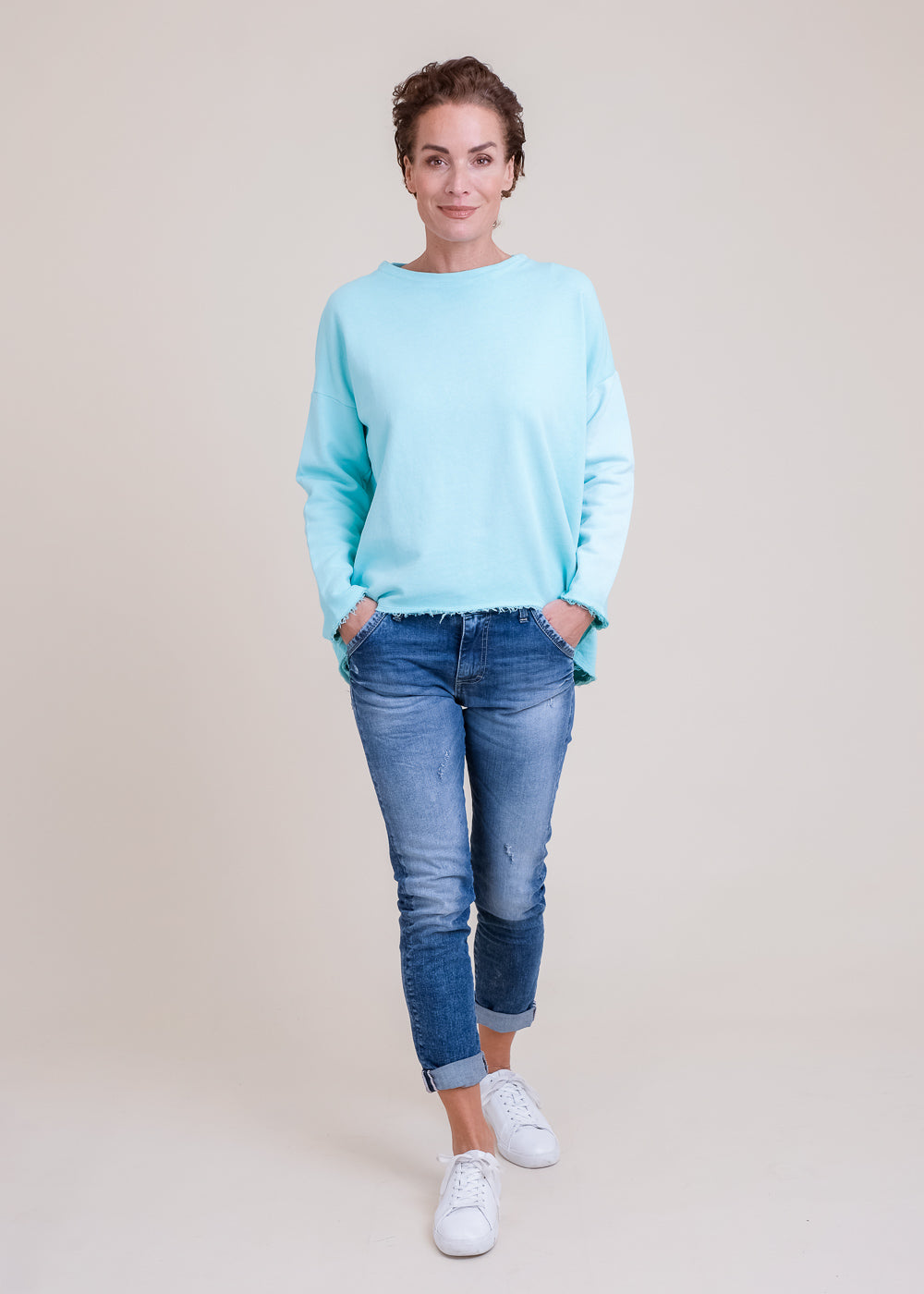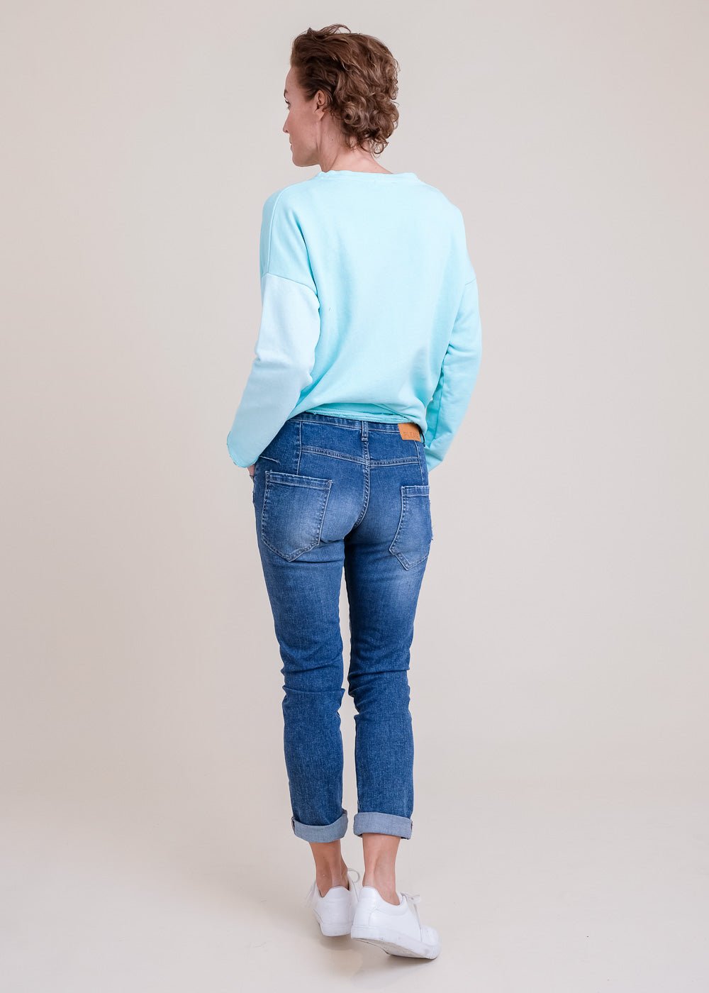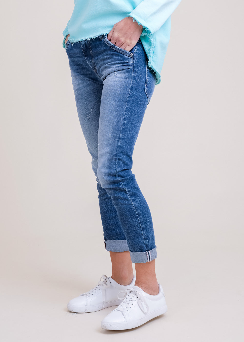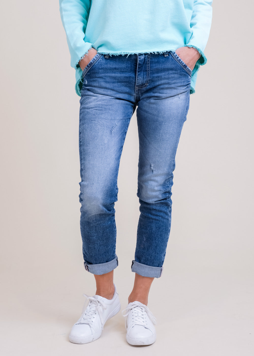 Please Jeans P85A blue denim. Grade geschnittene Jeans mit einer mittleren Bundhöhe und einem leicht ausgewaschenen Used-Look. Für einen lässigen Look sollte die Jeans gekrempelt getragen werden. Die Jeans ist mit einem Reißverschluss zu verschließen.