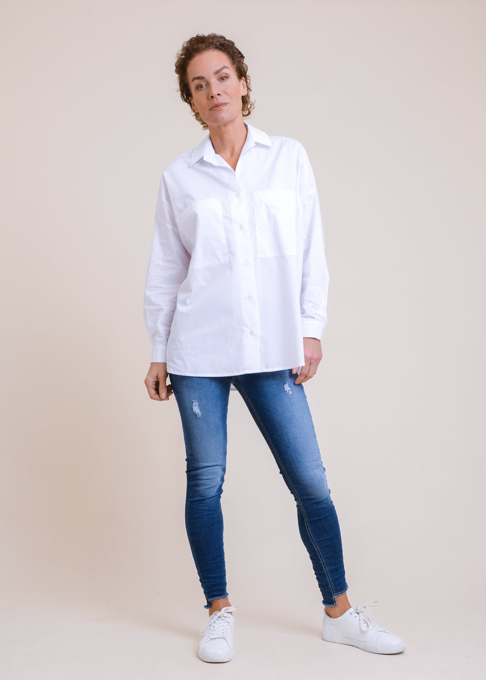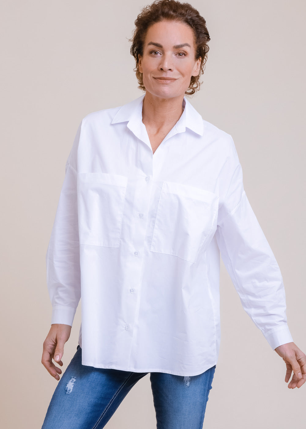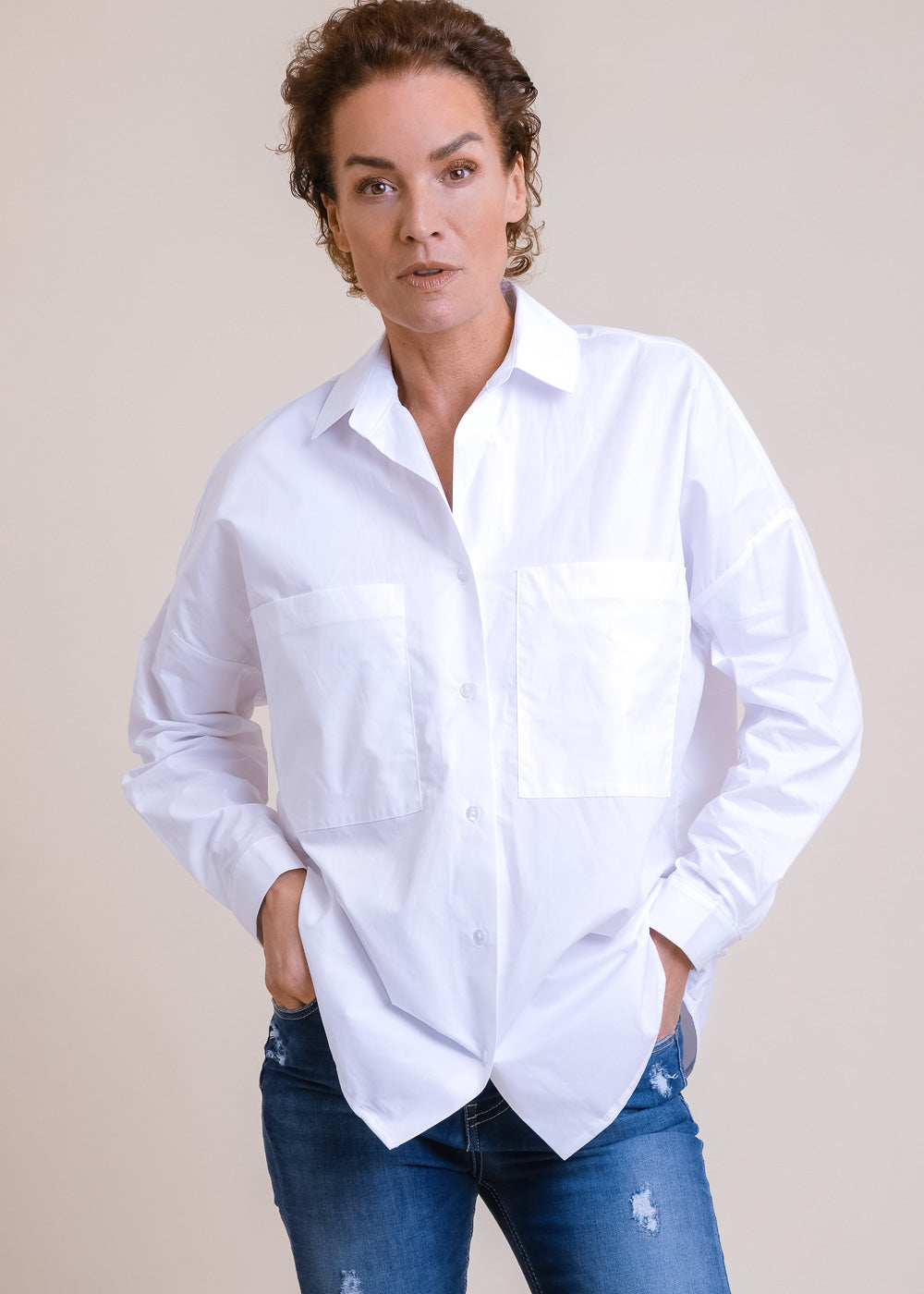 Ein Klassiker, der in keinen Kleiderschrank fehlen darf: Unsere Bluse in reinem Bianco - Ottico. Die Bluse ist langärmelig und besitzt einen Stehkragen, der nach Wunsch offen oder hochgeschlossen getragen werden kann. Die aufgesetzten Taschen auf Brusthöhe verleihen dieser Bluse ein modernes Design.