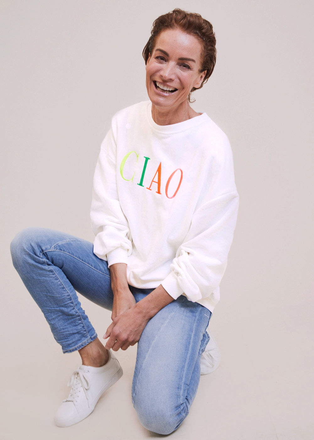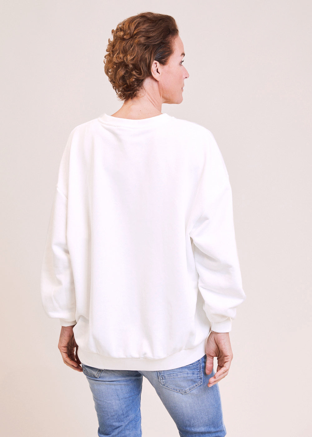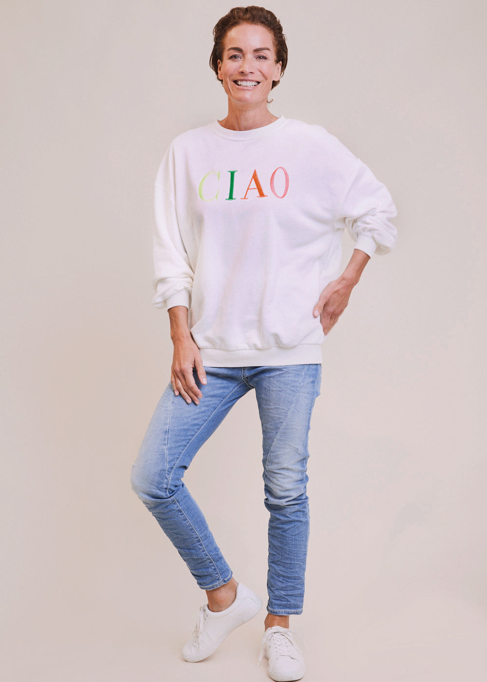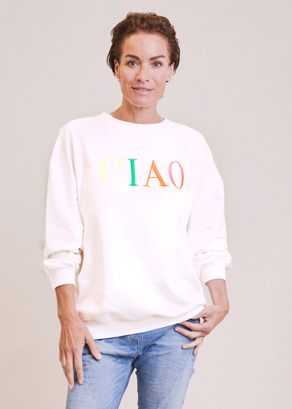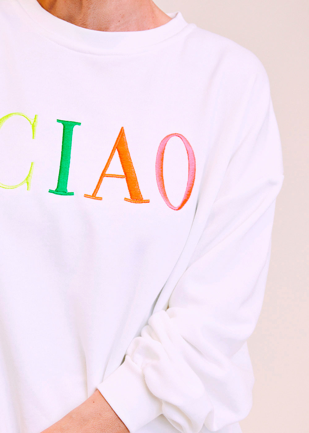 Bequemes Sweatshirt mit aufgesticktem Schriftzug in leuchtenden Farben. Das Sweatshirt hat einen Rundhals-Ausschnitt und überschnittene Schultern. Saumen und Ärmel sind von einem Rippenbündchen gezäumt.