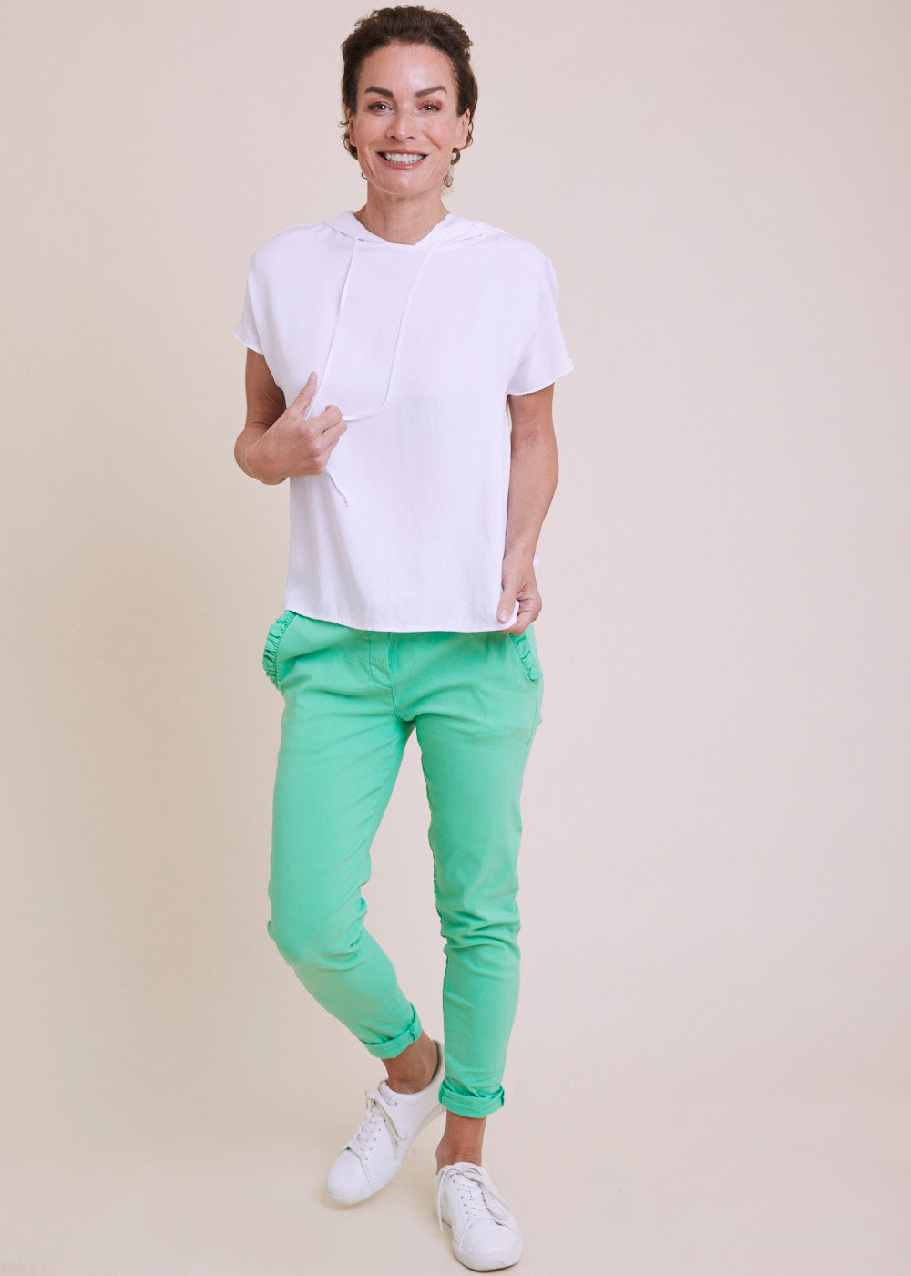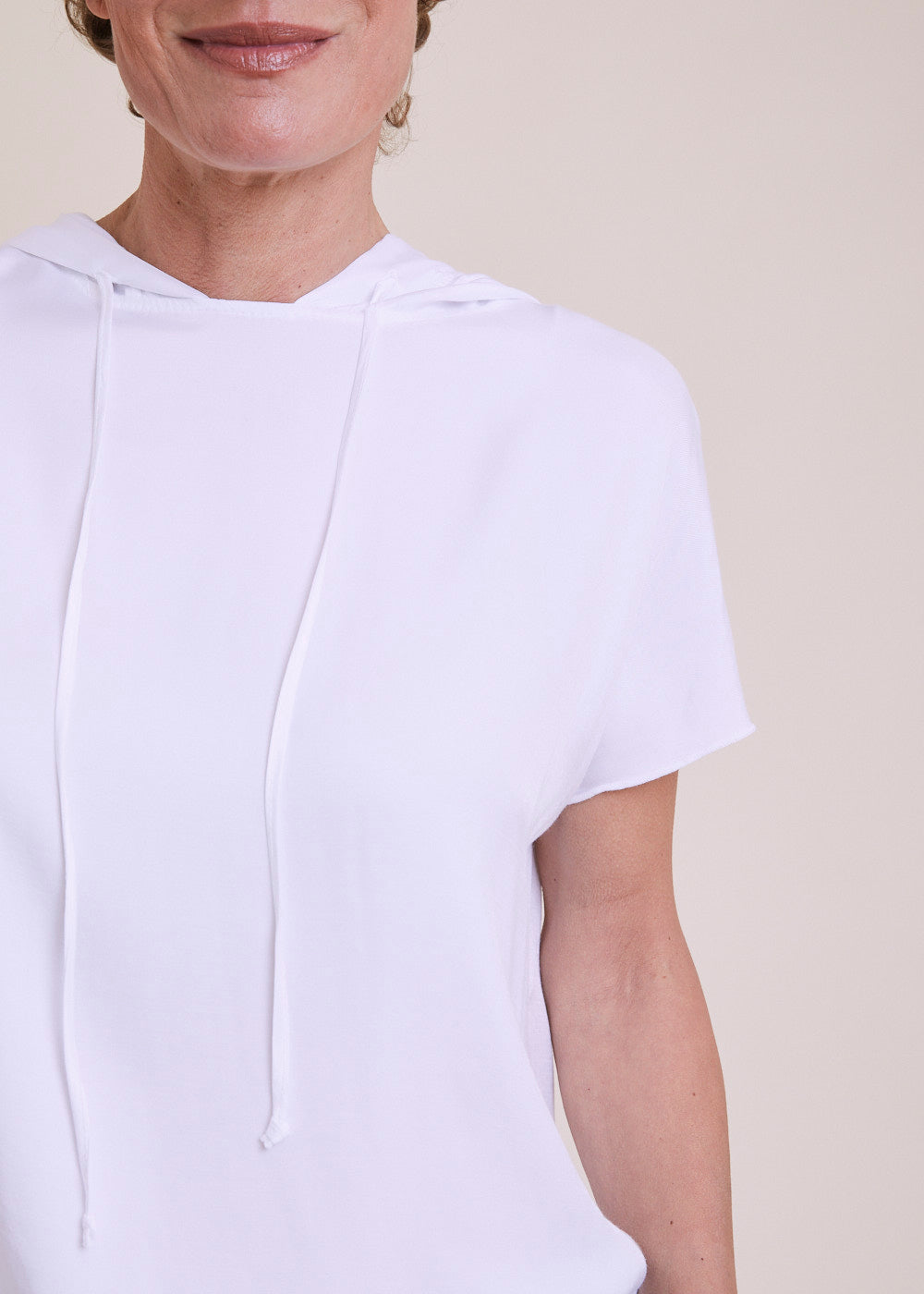 Locker geschnittene Bluse aus einem schönen Viskosemixmaterial. Im sportlichen Hoodie Style überrascht sie mit ihrer Kapuze. Mit kurz geschnittenen Armen und Banddetails.
