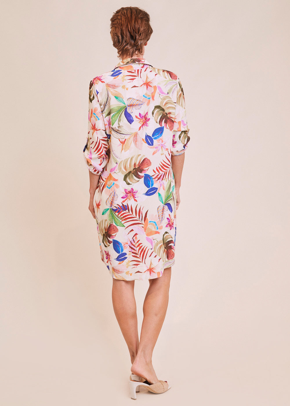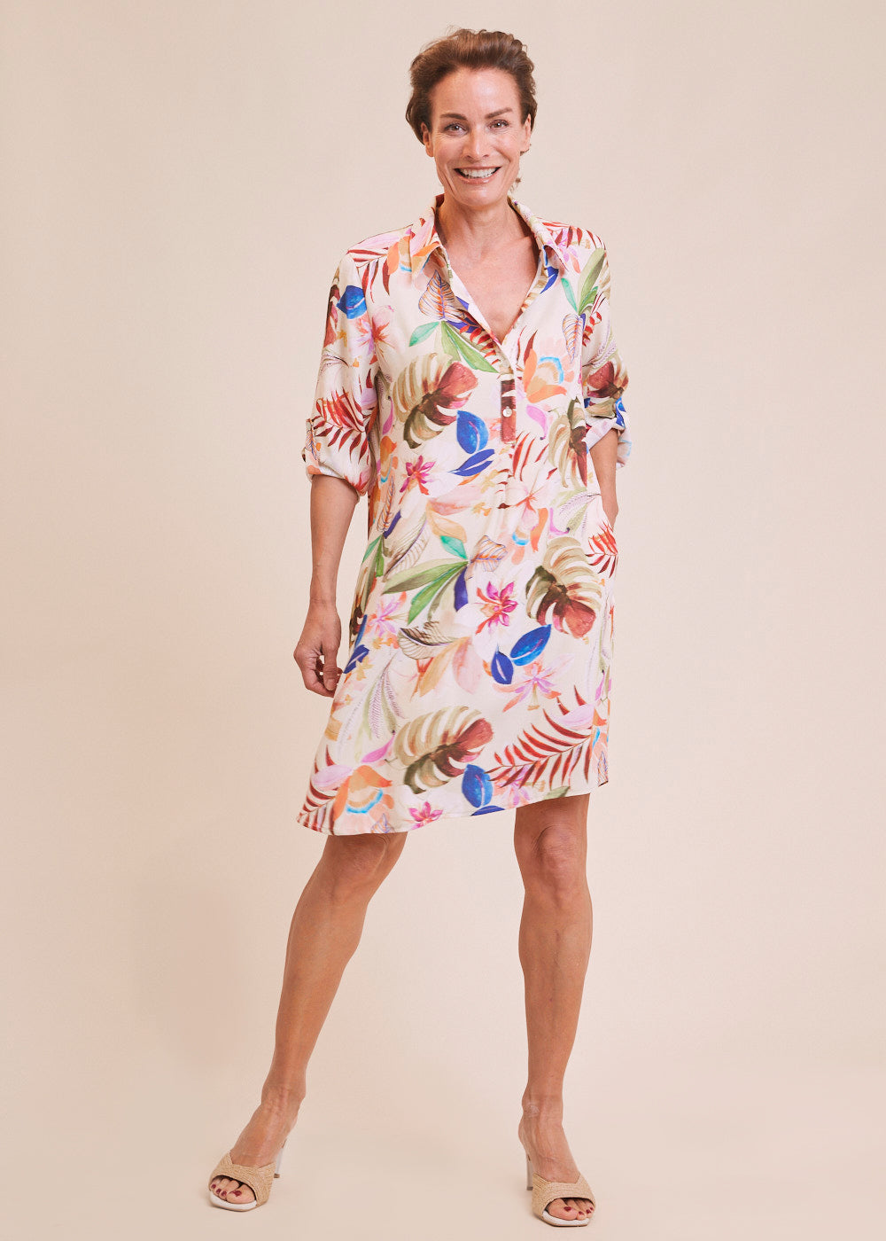 Lässig geschnittenes Hemdblusenkleid mit langen Armen mit besonderem Print. Aus einer weich fließenden Viskose mit Hemdkragen und Manschetten. Dieses Kleid kann entweder mit einem Gürtel antailliert oder einfach lässig getragen werden. Länge:103cm.