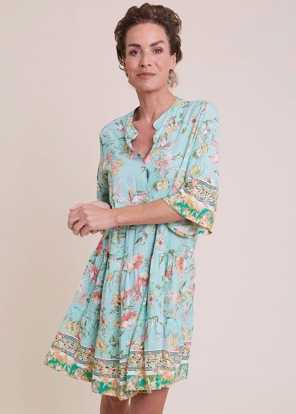 Mit diesem Kleid kann der Sommer kommen! Die gestuften Volants am Rockteil umspielen luftig die Oberschenkel und formen eine schmeichelnde Silhouette. Der V-Ausschnitt des Kleides mündet in einer Knopfleiste. Die 3/4-Ärmel sind leicht ausgestellt. Das Kleid ist mit einem floralen All-Over-Print versehen. Besonders schön, lässt sich das Kleid mit weißen Sneakern kombinieren, um einen lässigen Look zu kreieren.