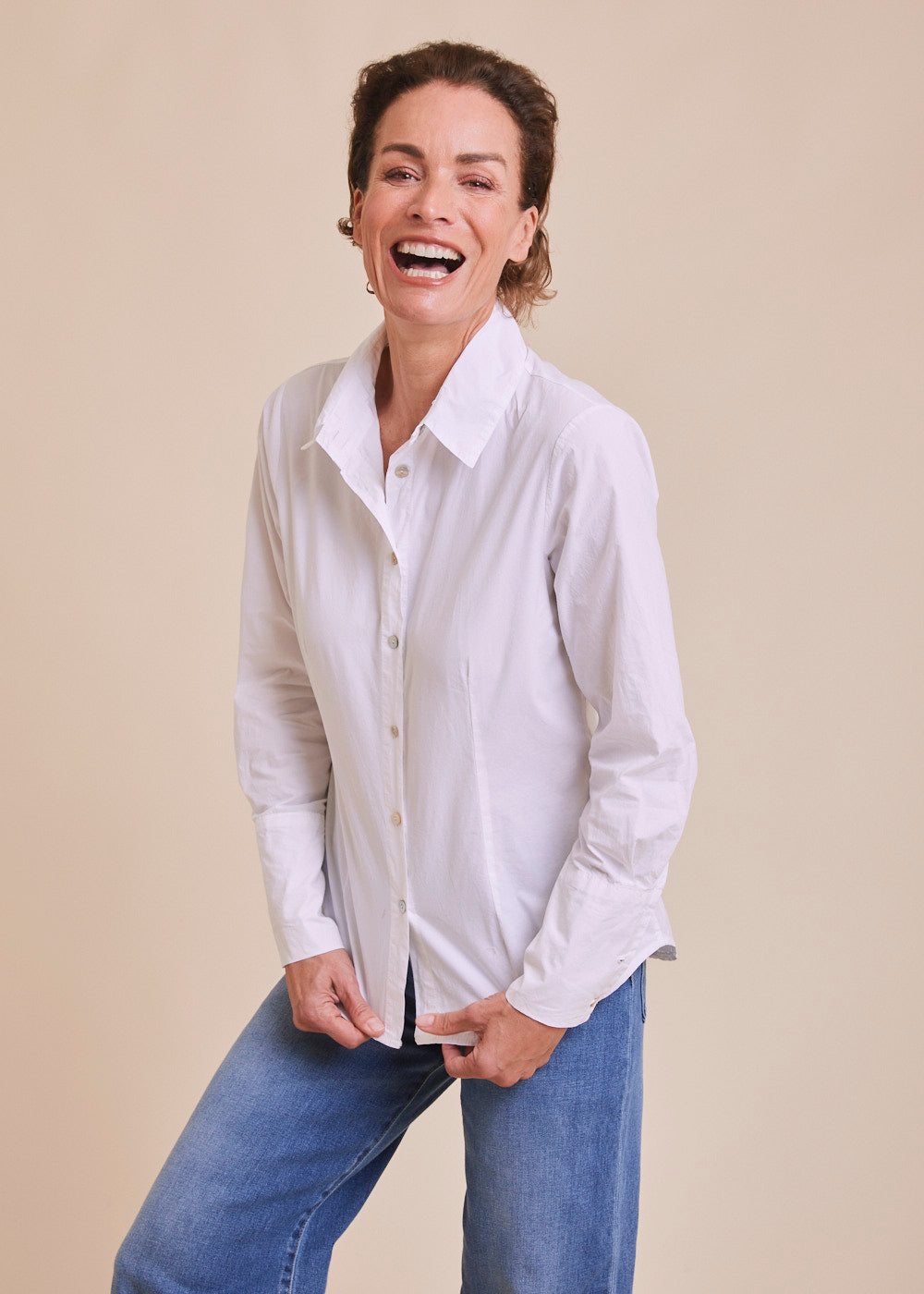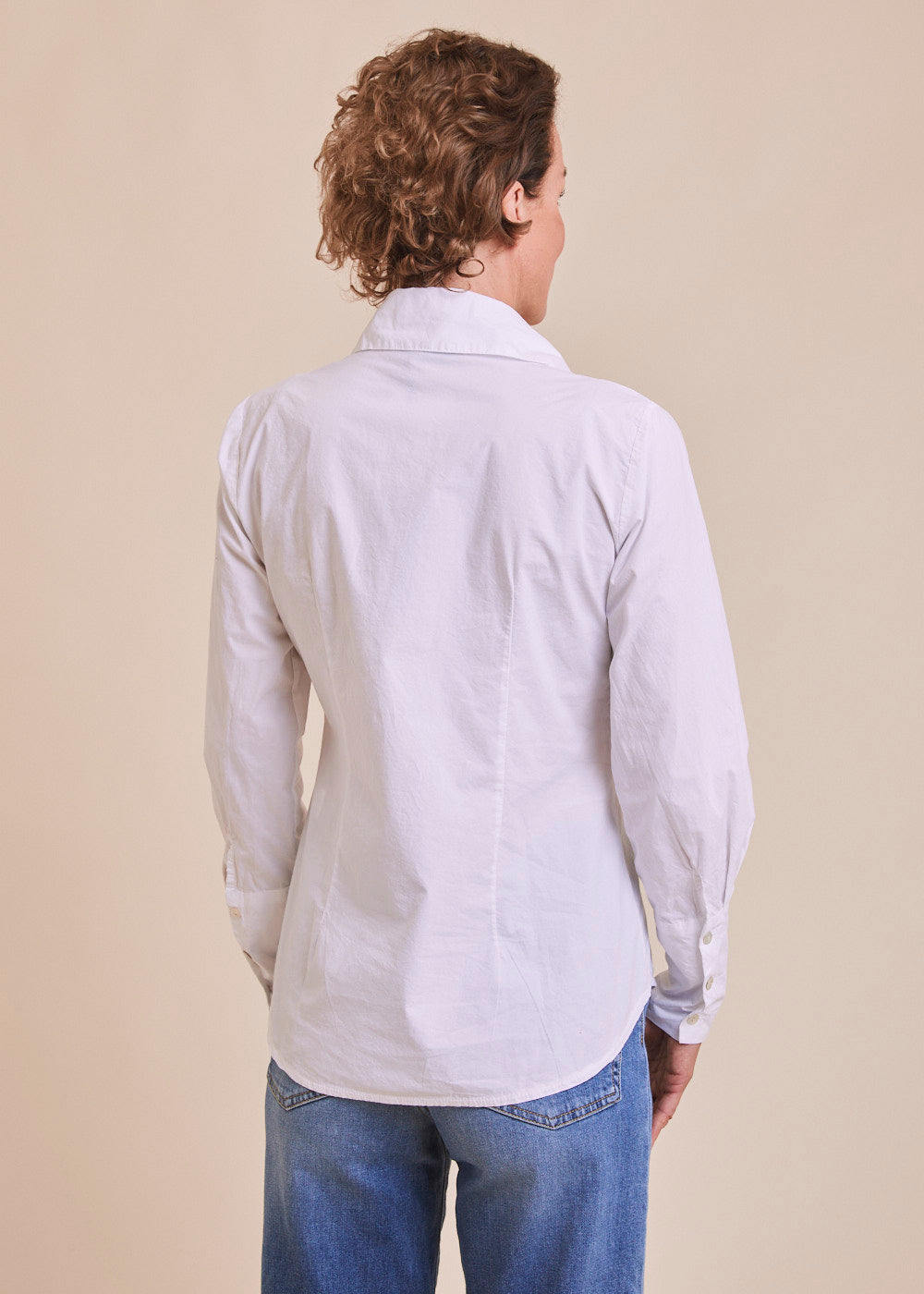 Schmaler und kürzer geschnittene Hemdbluse mit Hemdkragen und einer Knopfleiste. Lange Ärmel mit einer verlängerten geknöpften Manschette und einem abgerundeten Saum aus reiner Baumwolle. Mit einem etwas verlängerten Rückenteil und einer leicht antaillierten Taille. Länge:63cm .