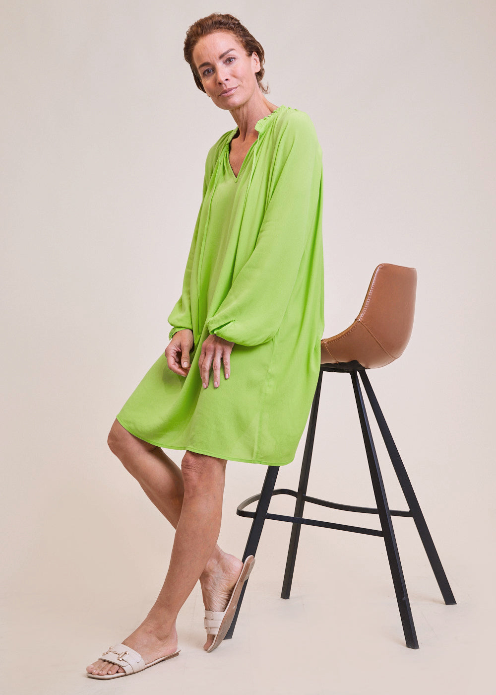 Luftig leichte Tunika in frischem Limettengrün. Das Kleid hat angedeutete Ballonärmel, die sich durch das Bündchen verschmälern. Das Dekoltée ist V-förmig ausgeschnitten und hat zwei Schmuckbänder, die nach belieben gestylt werden können. Unsere Longtunika ist der perfekte Look für den Sommerurlaub und macht durch ihre besondere Qualität viel Spaß beim Tragen!