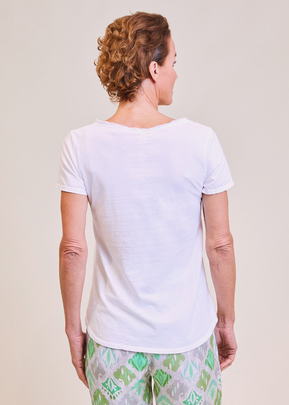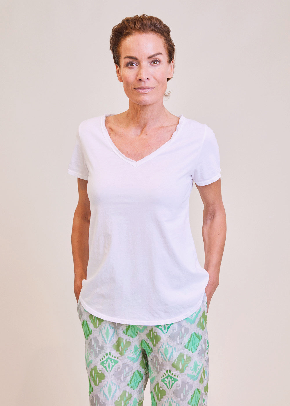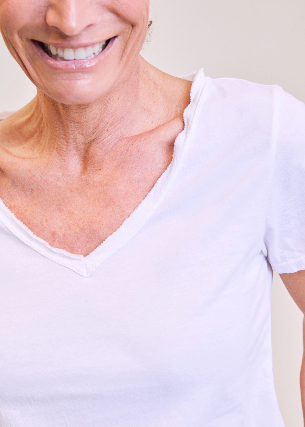Tolles Basic-Shirt mit Kurzarm. Das T-Shirt hat einen V-Ausschnitt mit offenen Kanten und einen leicht transparenten Look. Ein perfekter Artikel, um dein Outfit zu komplimentieren!