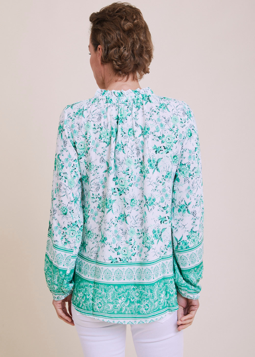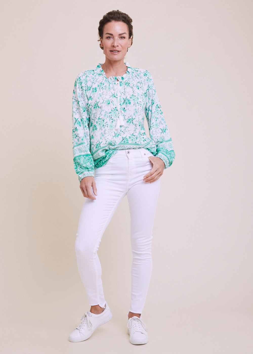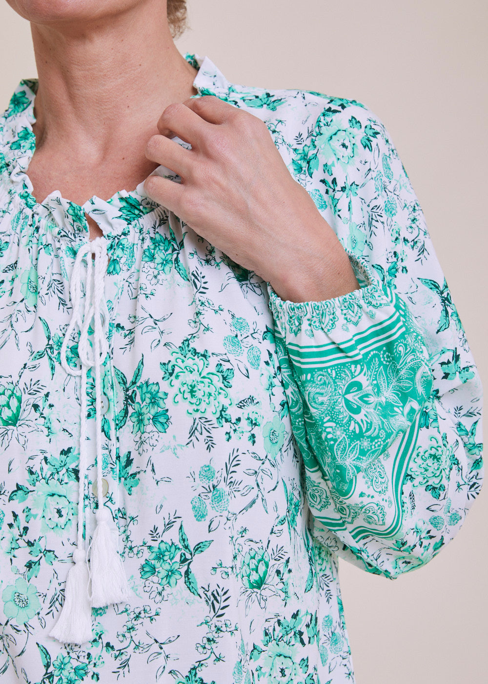 Fließende und verspielte Tunika aus einem großartigen Viskosematerial. Etwas länger und legerer geschnitten mit V-Öffnung und Bindebändchen am Rundhals-Ausschnitt. Vorne kürzer geschnitten als hinten. Länge:70cm.
