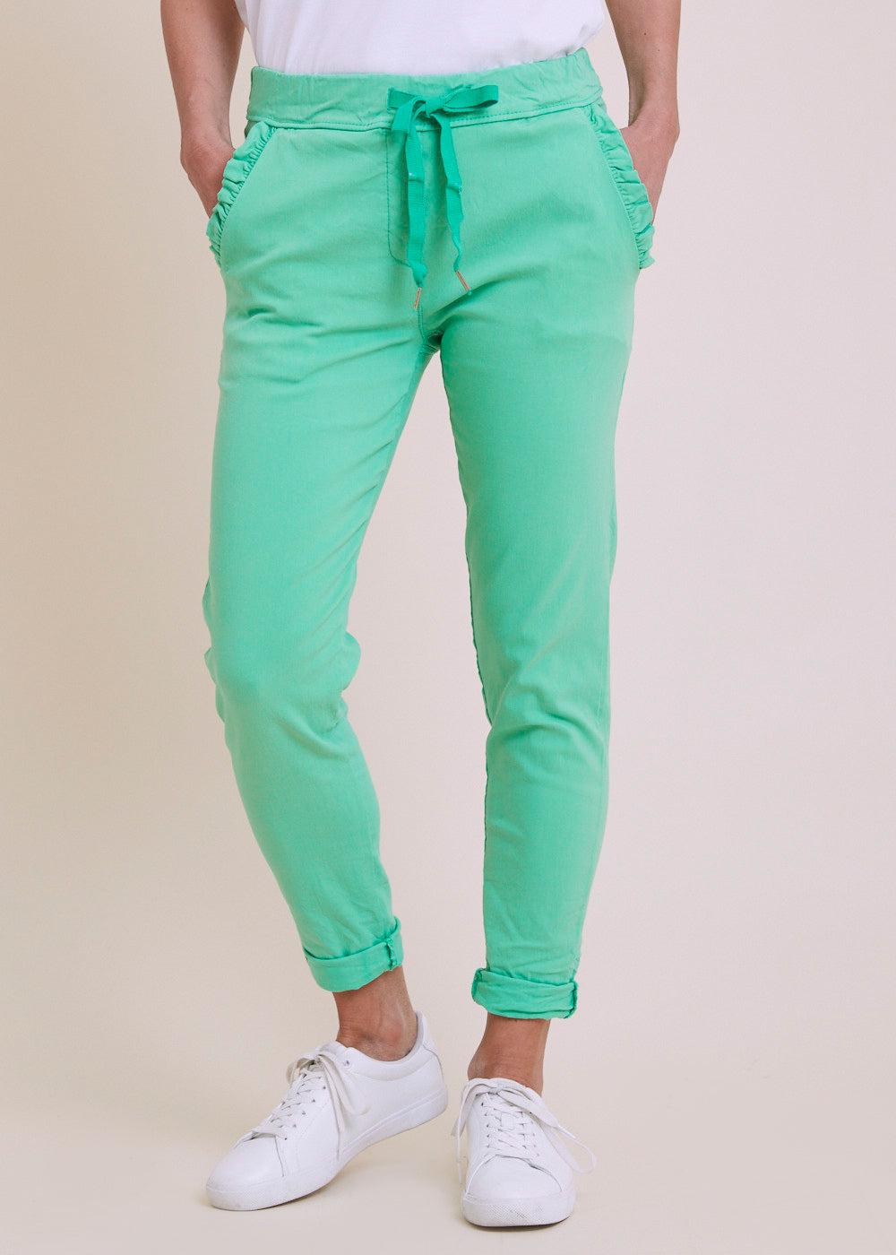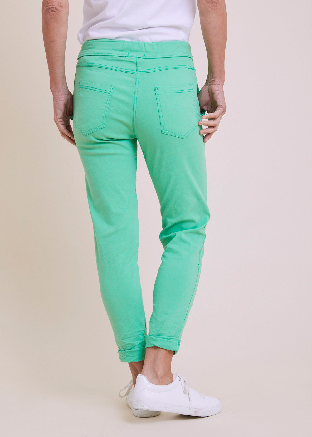 Unser Bestseller! Hose aus Viskose und Elasthan-Anteil. Dadurch sitzt sie super bequem und lässt sich prima zu Allem kombinieren. Gummizug im Bund, Tunnelzug mit Band und seitliche Eingriffstaschen. Länge:98 cm.