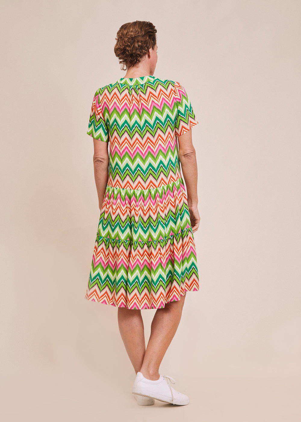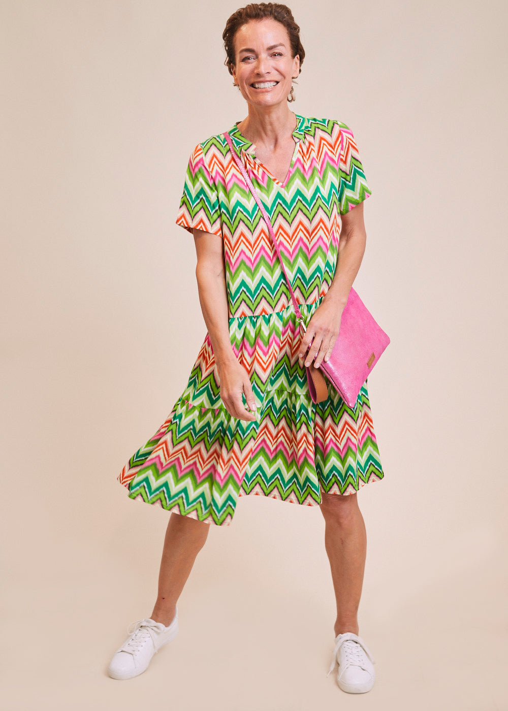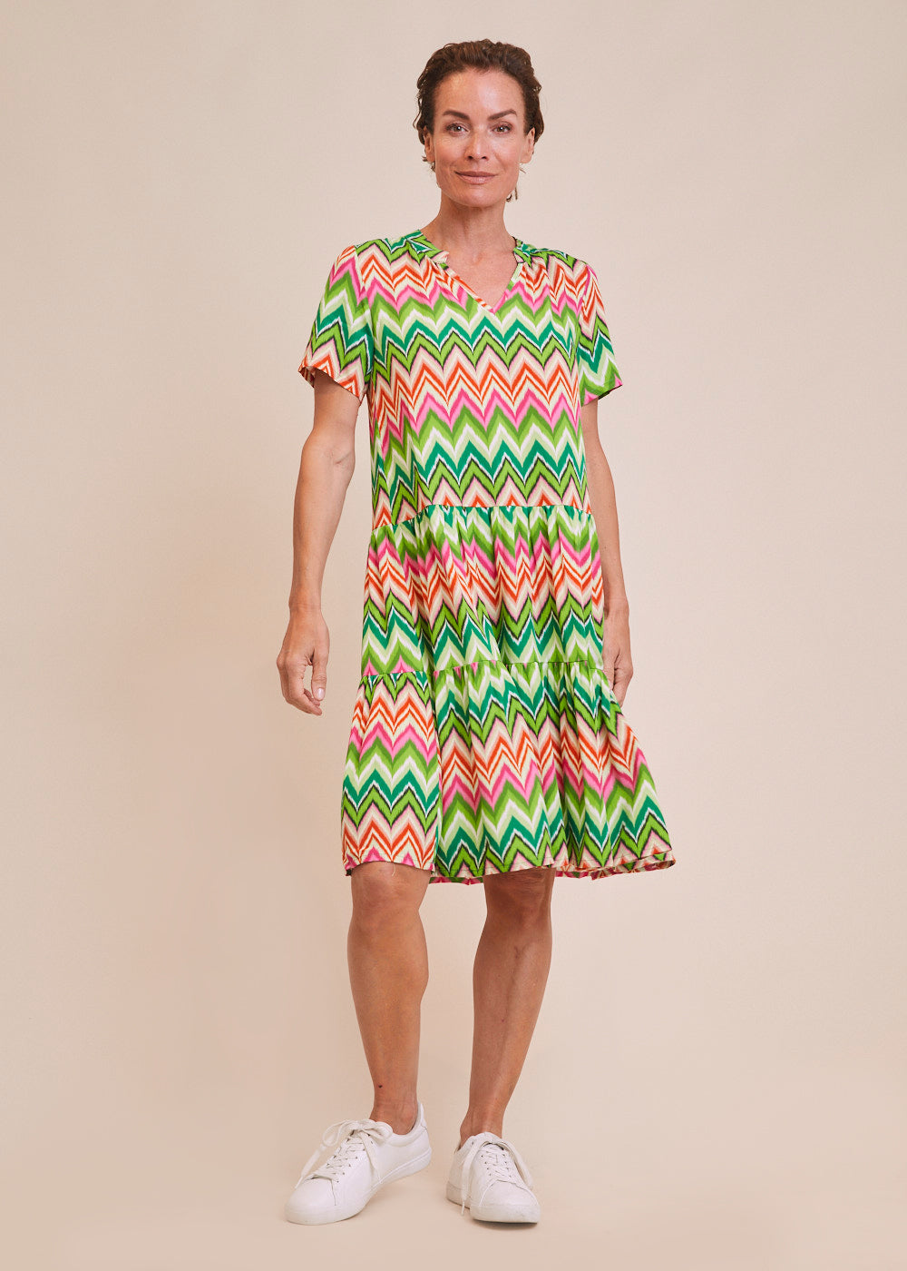 Dieses sommerliche Kleid erstrahlt in frischen Frühlingsfarben und einem All-Over-Print im Zick-Zack-Muster. Der Volant-Rock sorgt für ein luftig-leichtes Tragegefühl. Das Kleid besitzt einen V-Ausschnitt und einen angedeuteten Kragen.