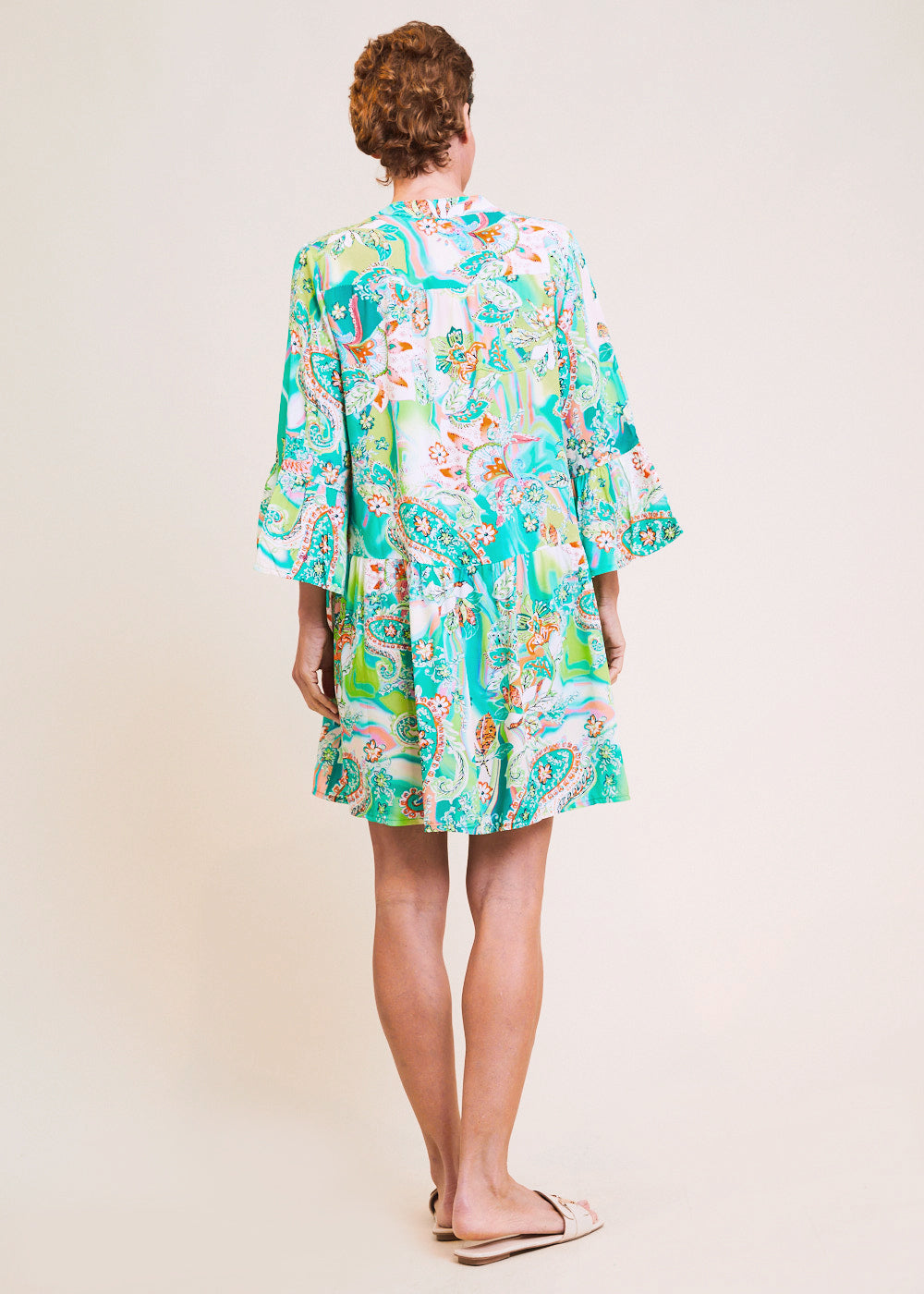 Sommerliches Kleid mit All-Over-Print. Das Kleid endet über dem Knie und läuft A-Linien-förmig aus. Rockteil und Ärmel bestehen aus Volants. Das Kleid hat eine durchgezogene Knopfleiste, die nach Belieben gestylt werden kann.
