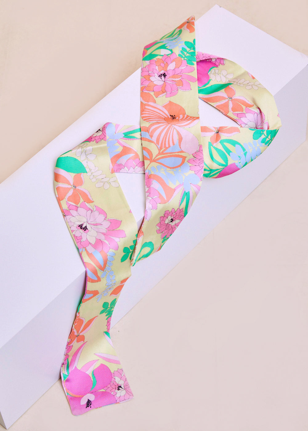 Wunderschöner Gürtel mit floralem Print in geschmeidigem Material. Ein tolles Accessoire mit leuchtenden Farben, um deinen Sommerlook zu vervollständigen.
