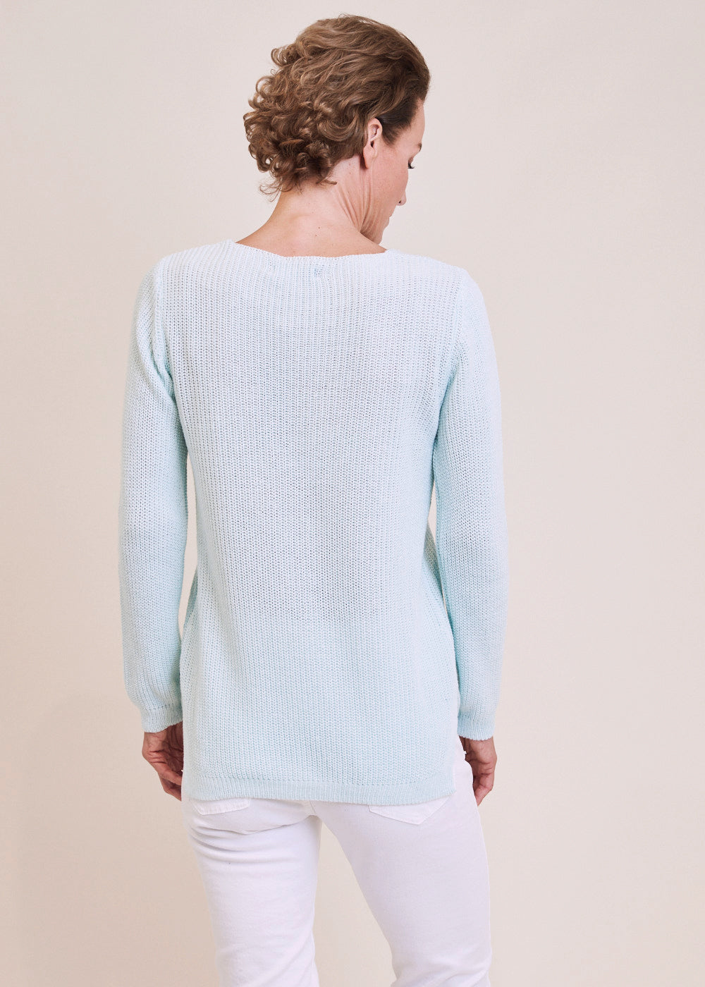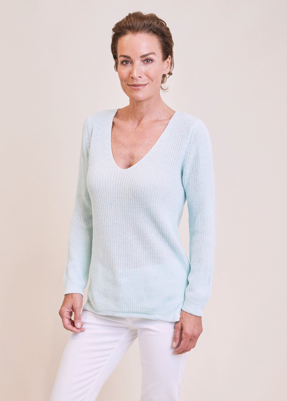 V-Neck Pullover aus einem Baumwollmix. Ein luftig leichter Pullover mit langen Armen und seitlichen Schlitzen. Perfekt für die kühleren Sommertage. Er hat ein Rippenbündchen an den Armen und am Saum.