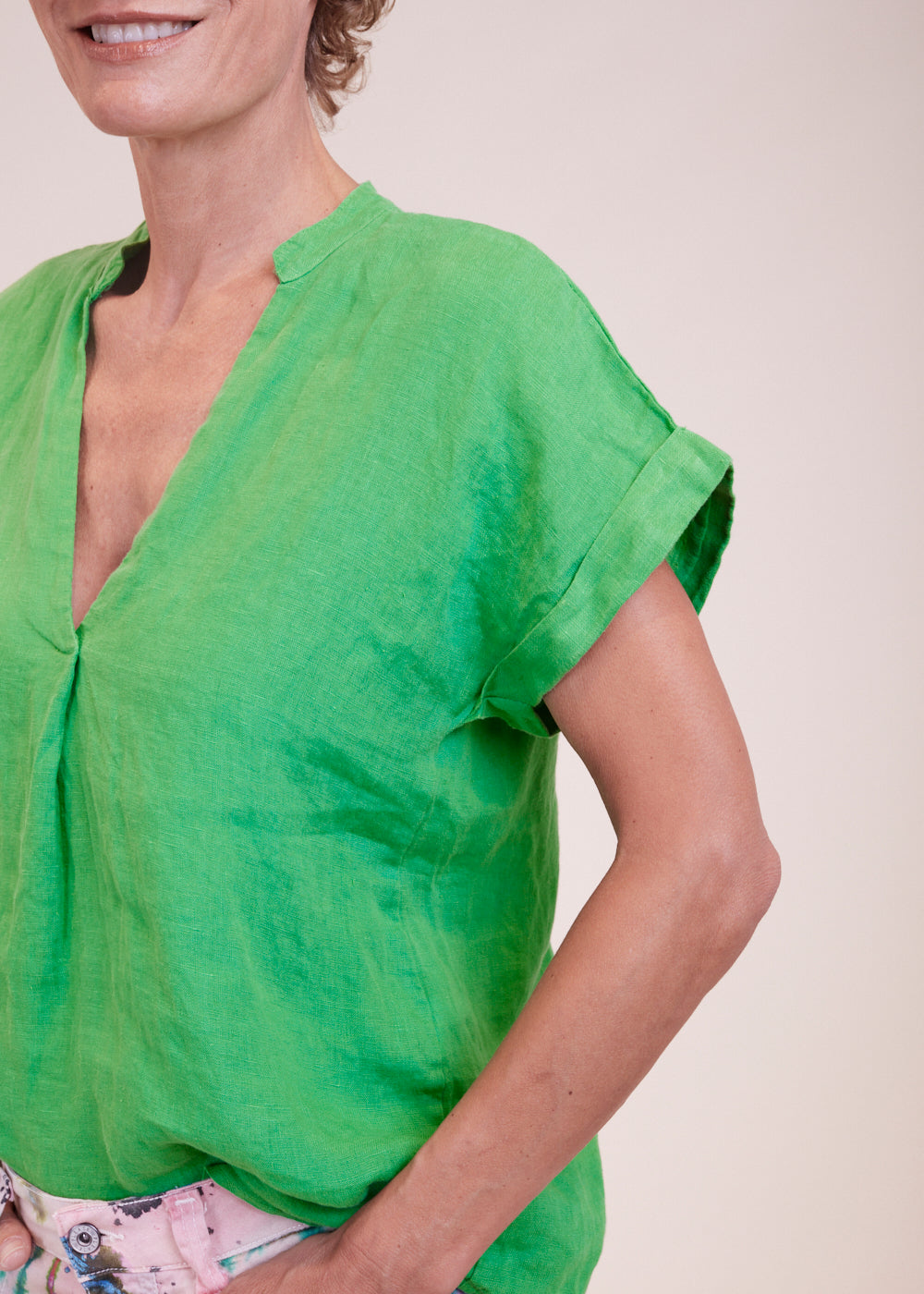 Tolle Sommerbluse aus 100% Leinen. Die Bluse hat kurze Ärmel, die am Bund einmal umgeschlagen sind und einen V-Ausschnitt, der in einer Schmuckfalte endet. Der angedeutete Stehkragen und die gerade Passform sorgen für einen entspannten und modernen Look.