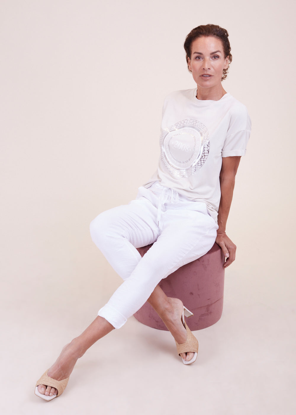 Tolles Kurzarm-Shirt mit großem Silber-Print auf Brusthöhe. Der weiche Stoff schmiegt sich angenehm an den Körper und sorgt für ein komfortables Tragegefühl. Perfekt geeignet für den Sommer!