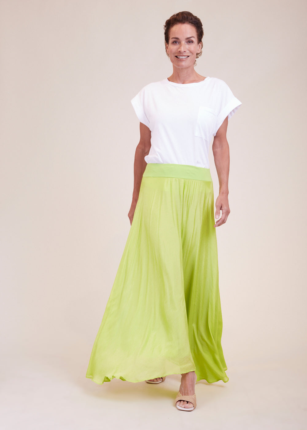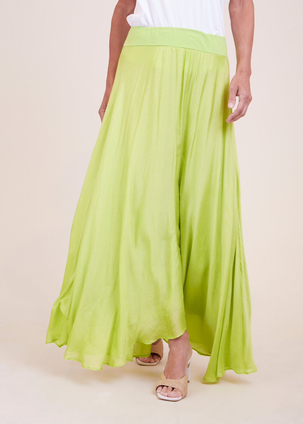 Luftig-leichter Maxirock in frischen Limettengrün. Dehnbarer Bund für ein extra komfortables Tragegefühl. Der Rock umspielt durch seine asymmetrische Form wundervoll den Unterkörper und schwingt beim Laufen mit.