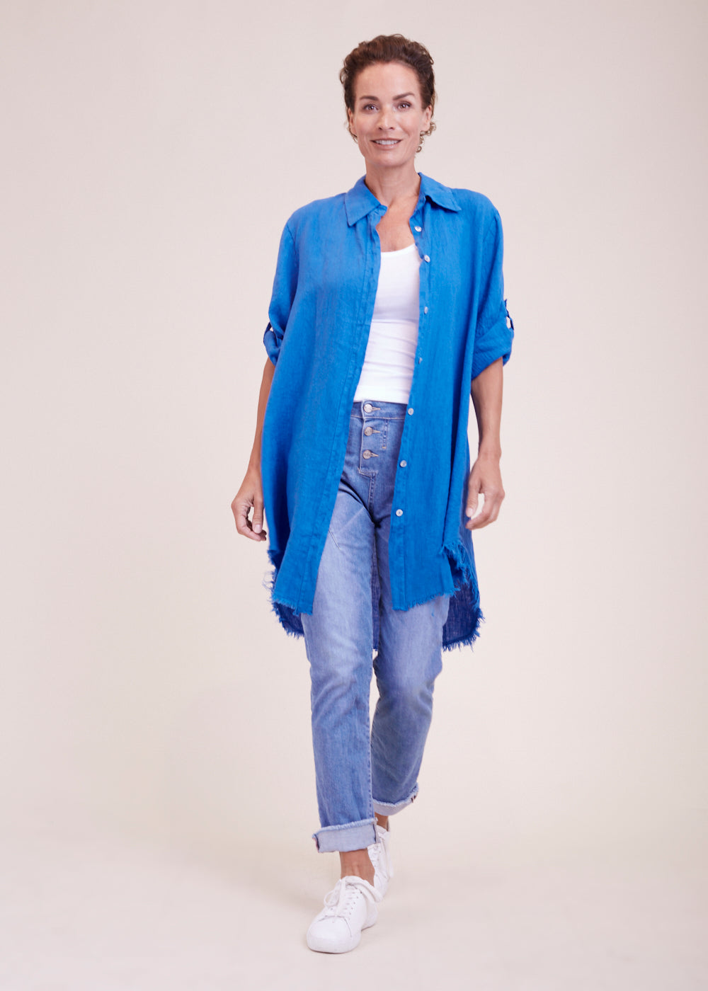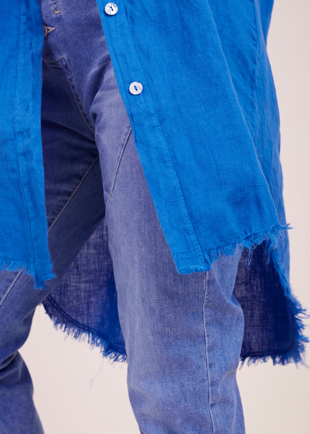Legeres Over-Size Hemd aus 100% Leinen. Das Hemd hat eine durchgezogene Knopfleiste und einen Hemdblusenkragen. Aufgesetzte Taschen auf Brusthöhe. Der asymmetrische Schnitt und der offene Saum machen diesen Artikel zu einem echten Trendteil, das zusätzlich durch seine leuchtende Farbkraft besticht.
