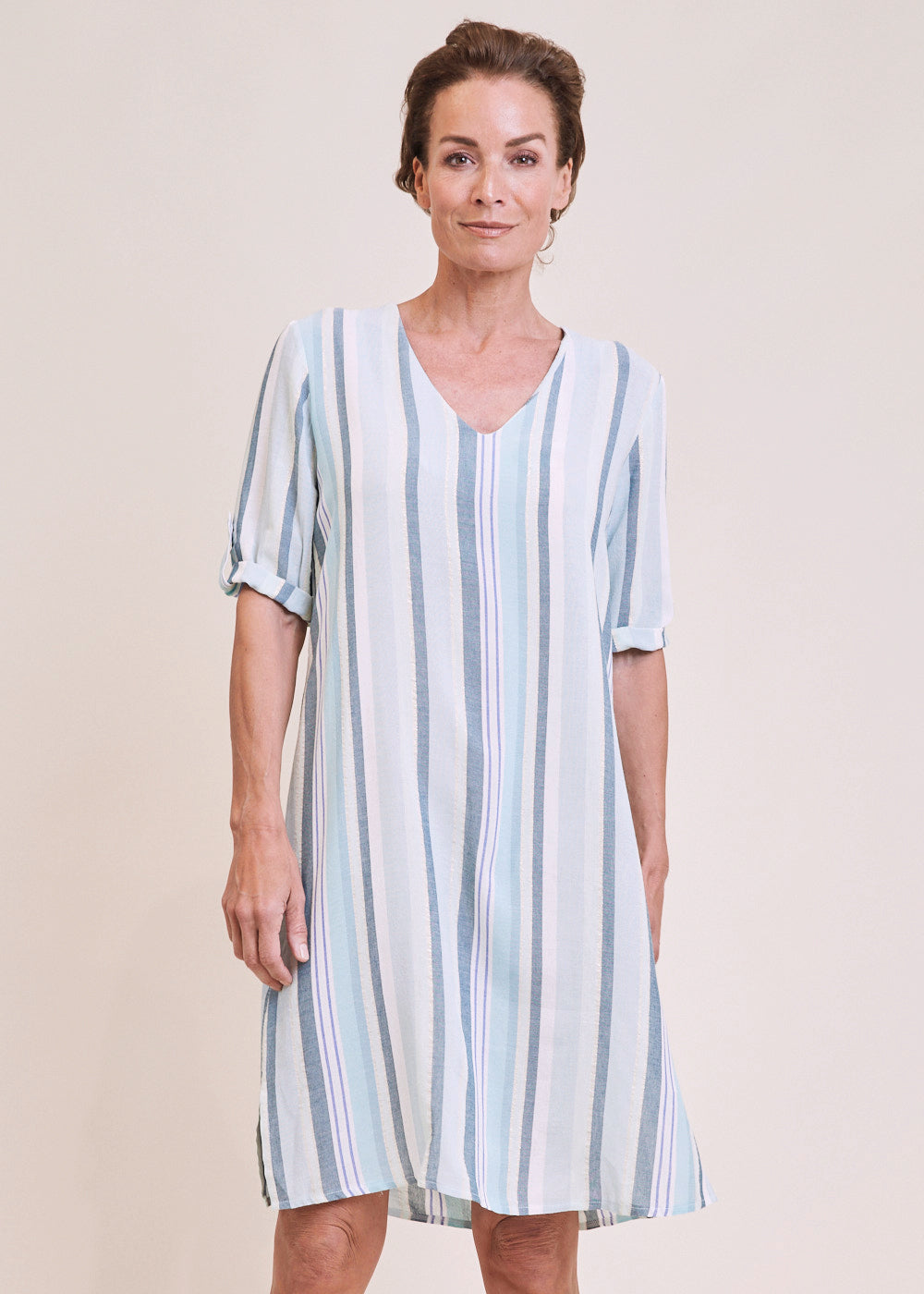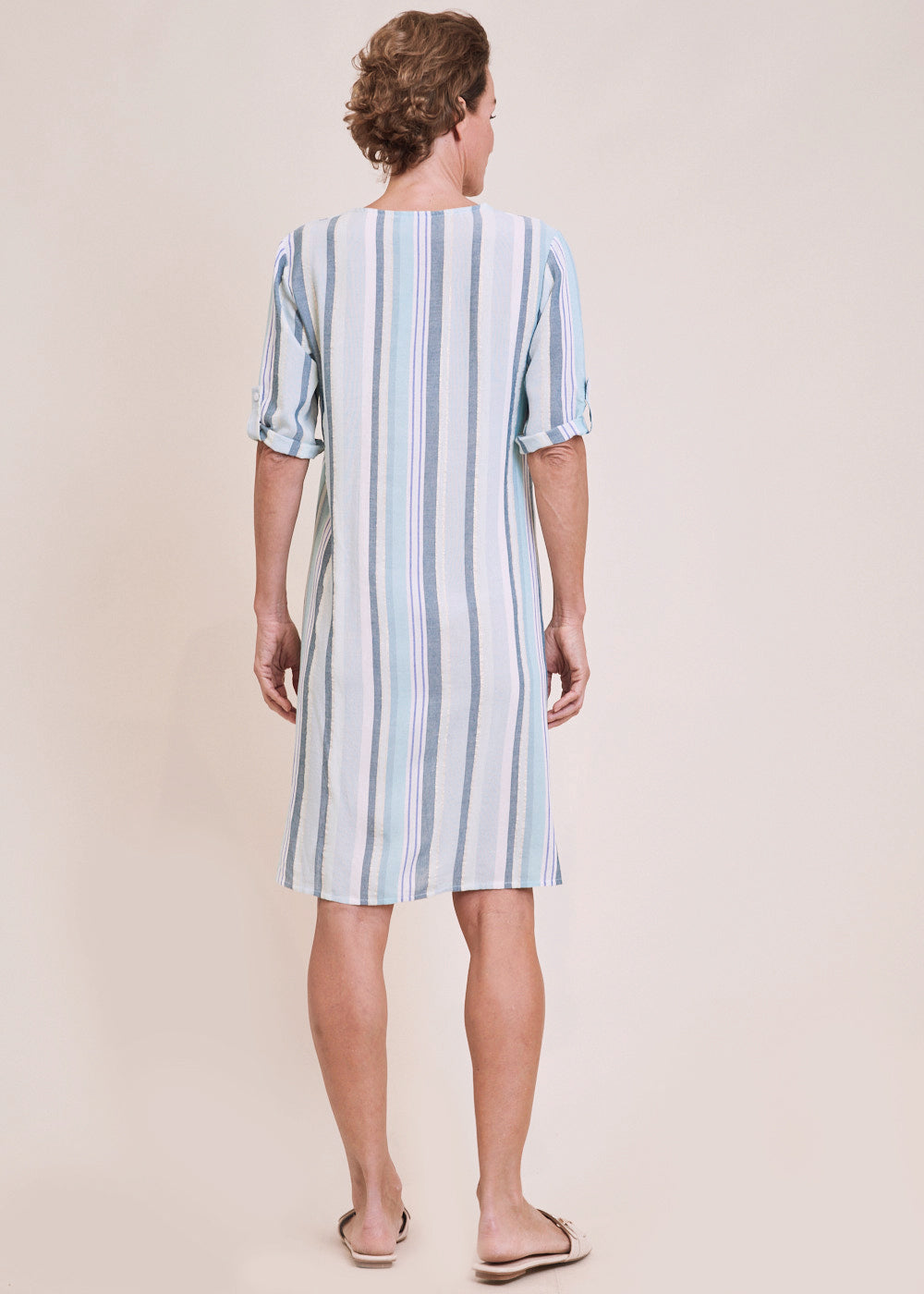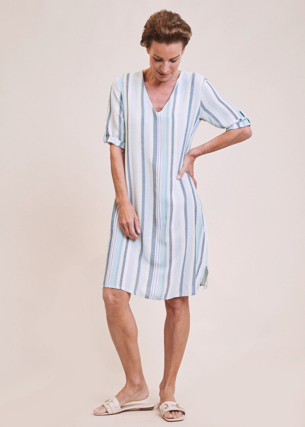 Dieses sommerliche Kaftan-Kleid aus natürlicher Viskose ist von der Passform gerade geschnitten und Figur umspielend und endet kurz über dem Knie. Die Ärmel sind locker geschnitten, halblang und lassen dich durch eine Knopflasche auch umgekrempelt tragen. Das Kleid besitzt einen V-Ausschnitt, der das Dekolleté vorteilhaft in Szene setzt und einen Streifen-Print in vertikaler Optik, der verschlankend wirkt. Die schmalen Goldstreifen im Muster wertend diesen tollen Artikel besonders auf!