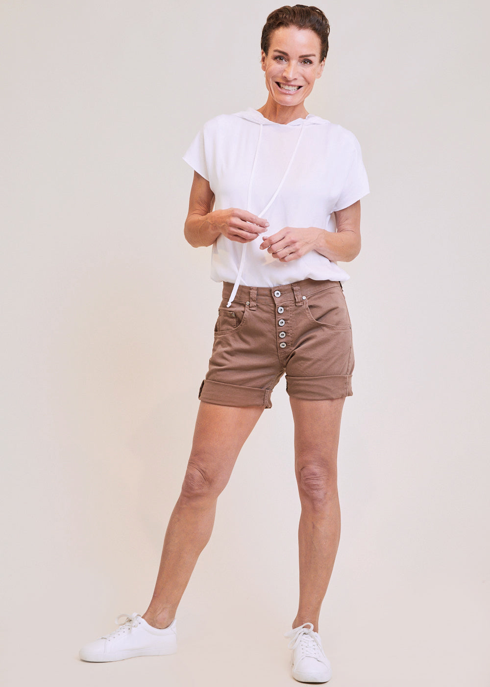 Yes, Please! Diese tolle Please-Shorts passt sich durch ihre außergewöhnliche Stretch-Qualität perfekt an deine Figur an und lässt dich den Alltag bequem meistern! Die mittlere Leibhöhe sorgt für einen sicheren Sitz der Hose etwas unterhalb des Bauchnabels. Sie hat eine sichtbare Knopfleiste und das bekannte Metallherz auf der hinteren Gesäßtasche.