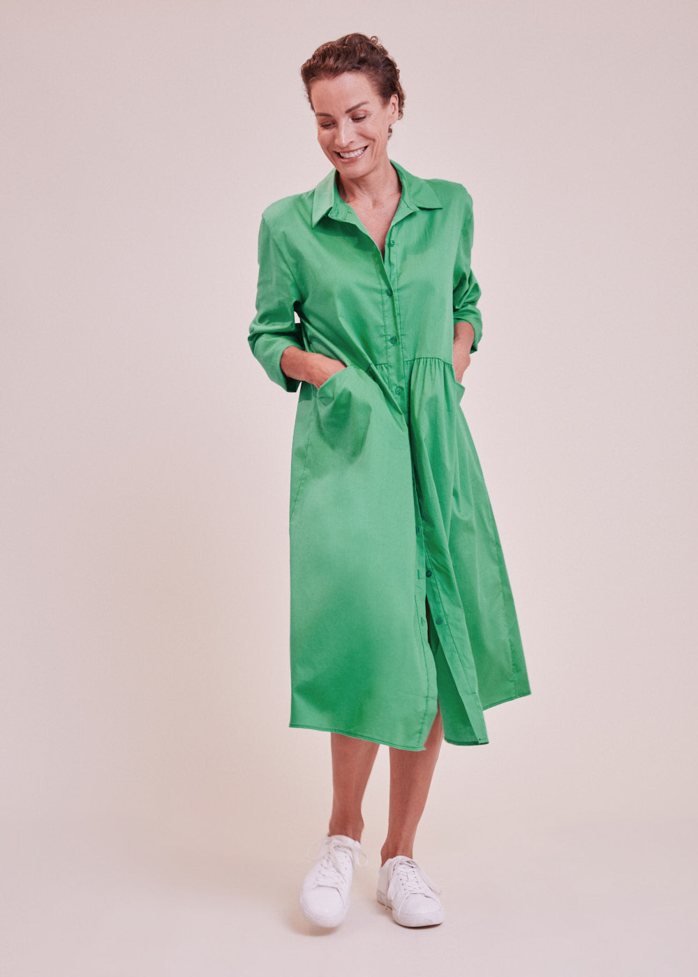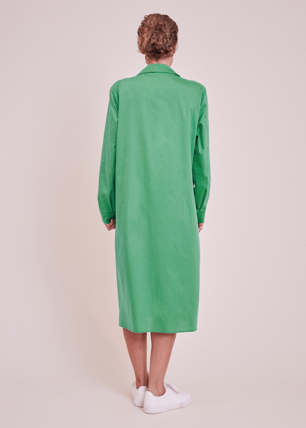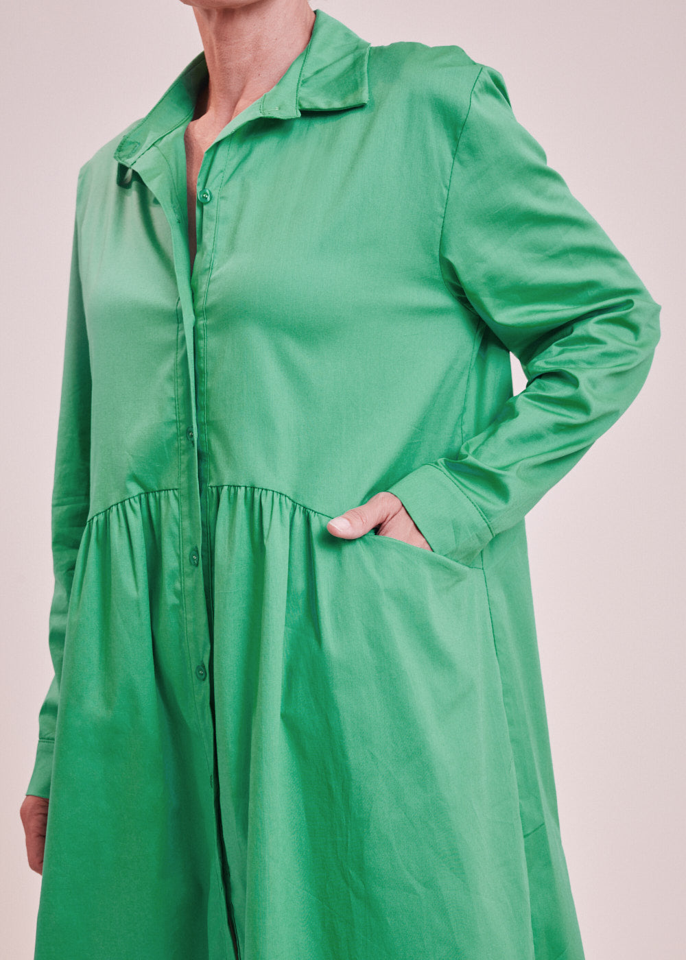 Länger geschnittenes Midikleid mit Stufen aus reiner Baumwolle mit seitlichen Eingriffstaschen. Das Kleid hat einen kleinen Stehkragen und lange Arme, die nach belieben hochgerafft werden können. Mit Knopfleiste und Manschetten an den Armen.