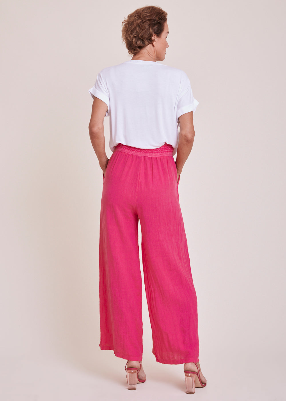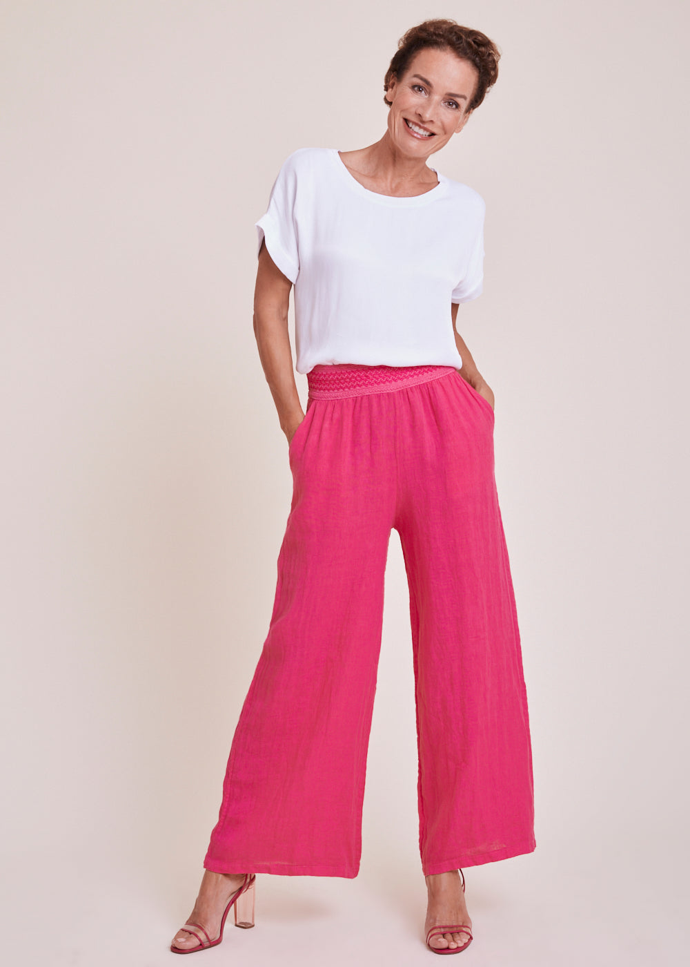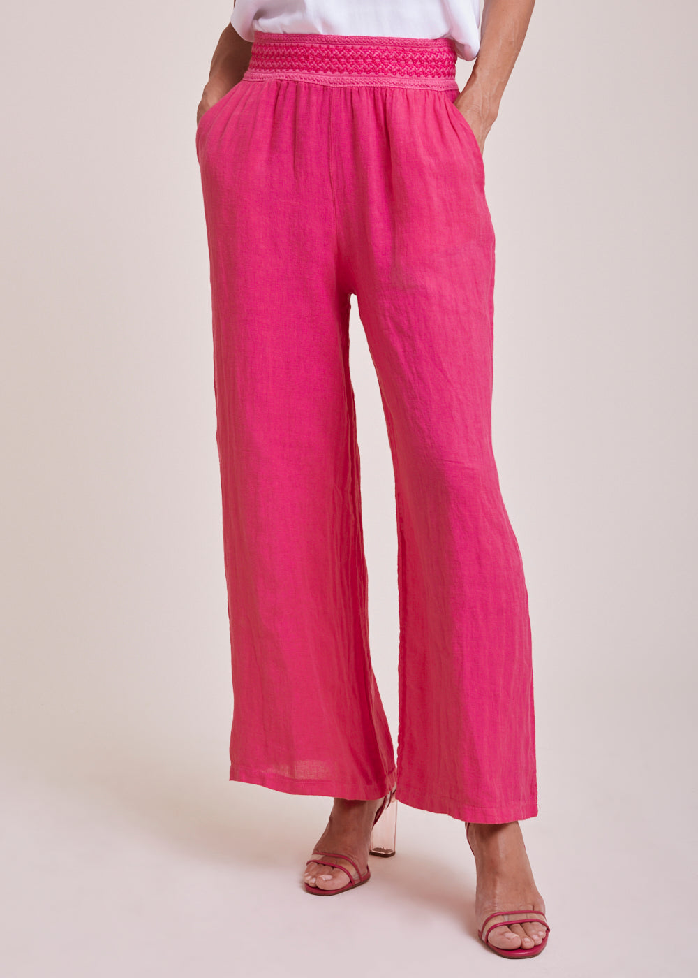 Luftige Sommerhose in der Trendfarbe Fuxia aus 100% Leinen. Die Hose hat seitliche Eingriffstaschen und einen bestickten Schmuckbund. Die Beine sind weit ausgestellt.