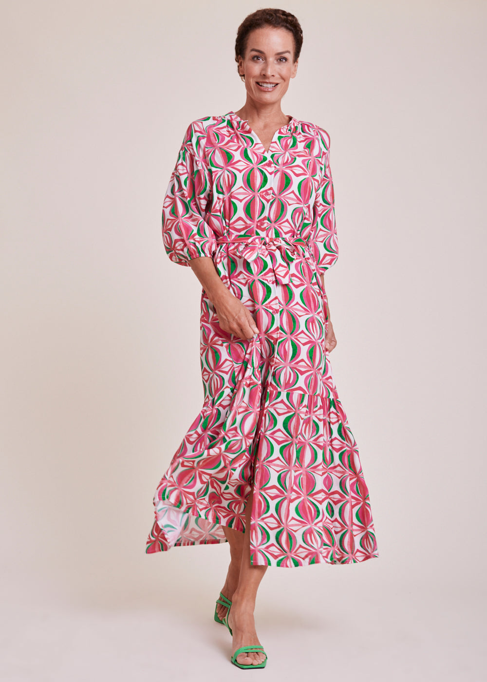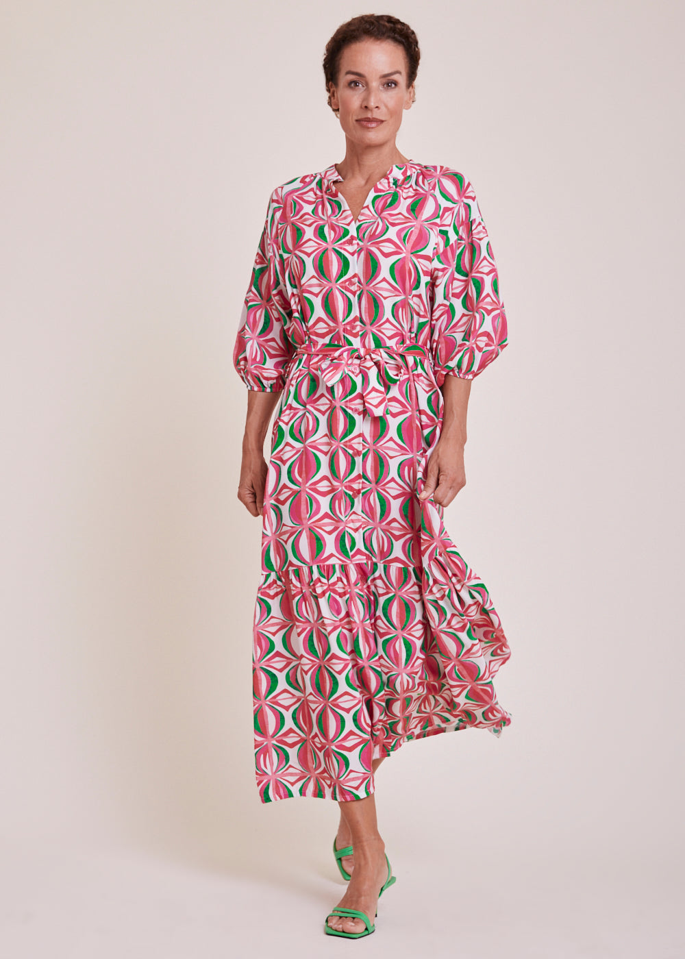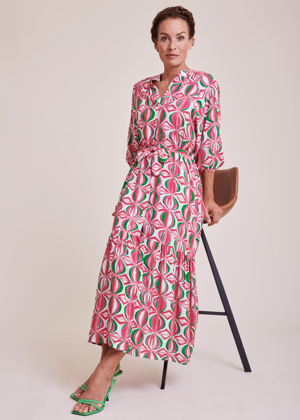 Wundervolles Satinkleid mit All-Over-Print in sommerlichen Farben. Das Kleid hat 3/4 lange Ballonärmel und einen Gürtel auf Taillenhöhe, der eine feminine Figur zaubert. Der V-Ausschnitt mit angedeutetem Stehkragen mündetet in eine durchgezogene Knopfleiste.