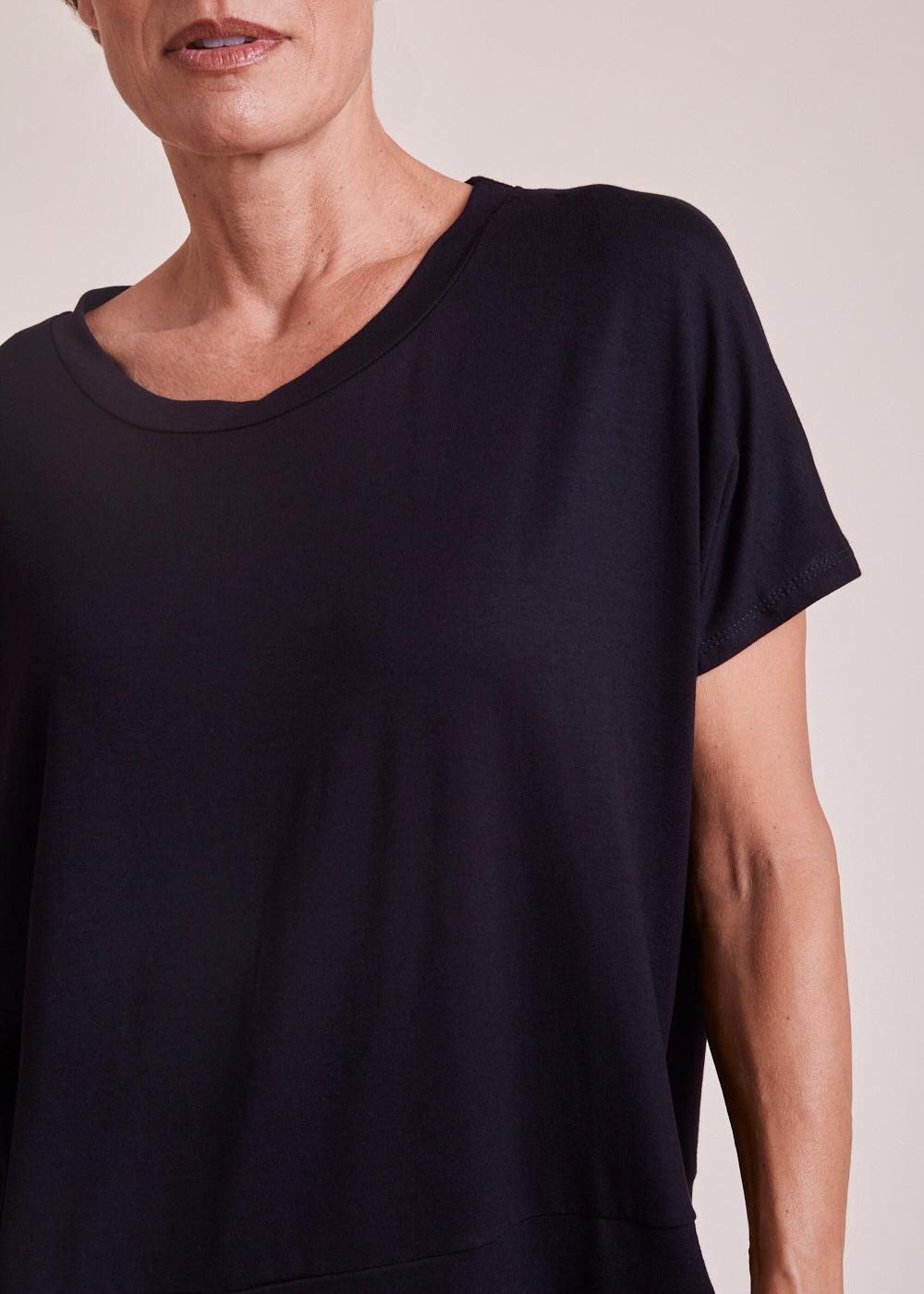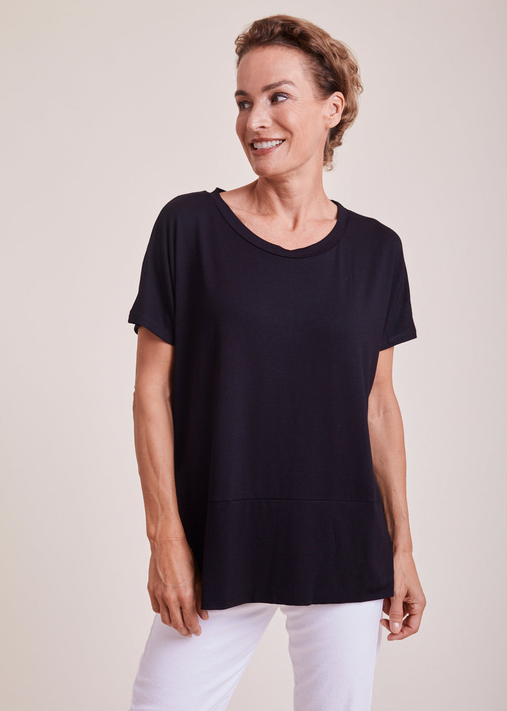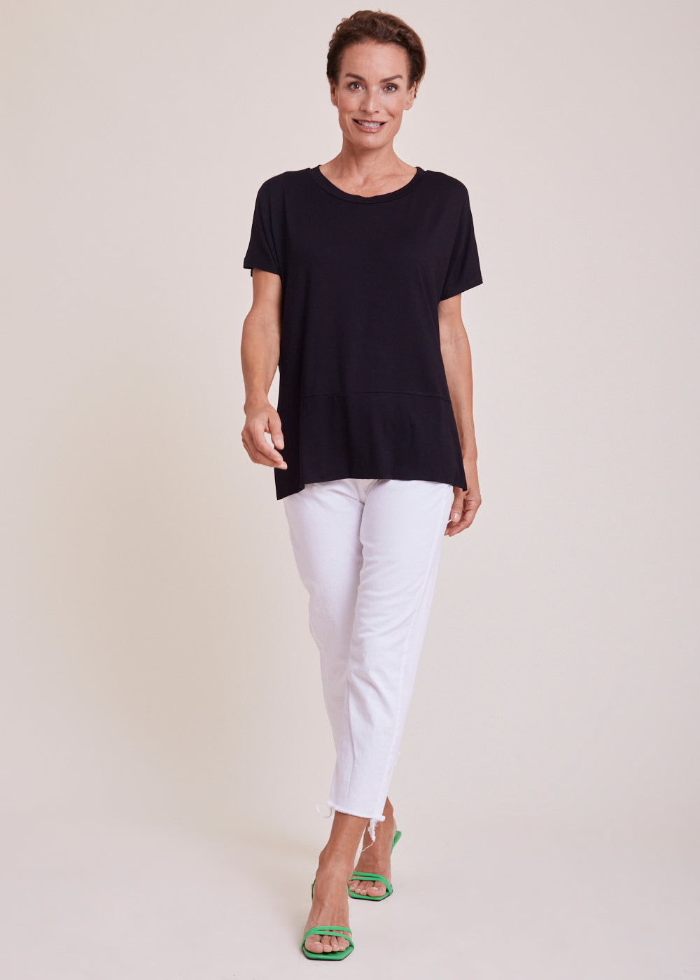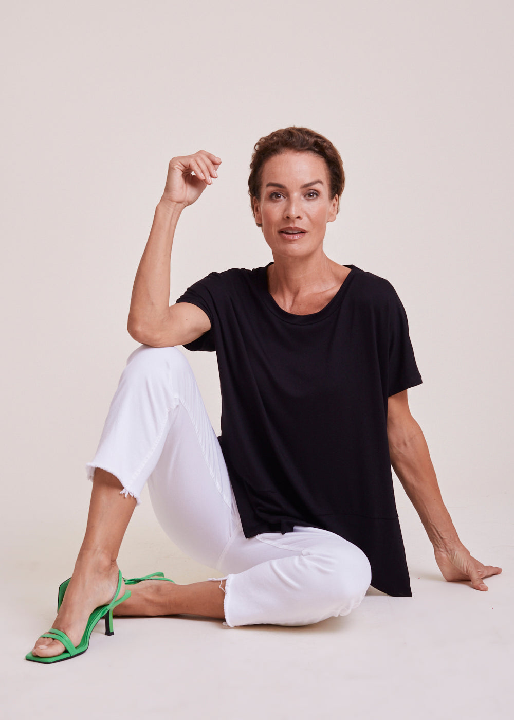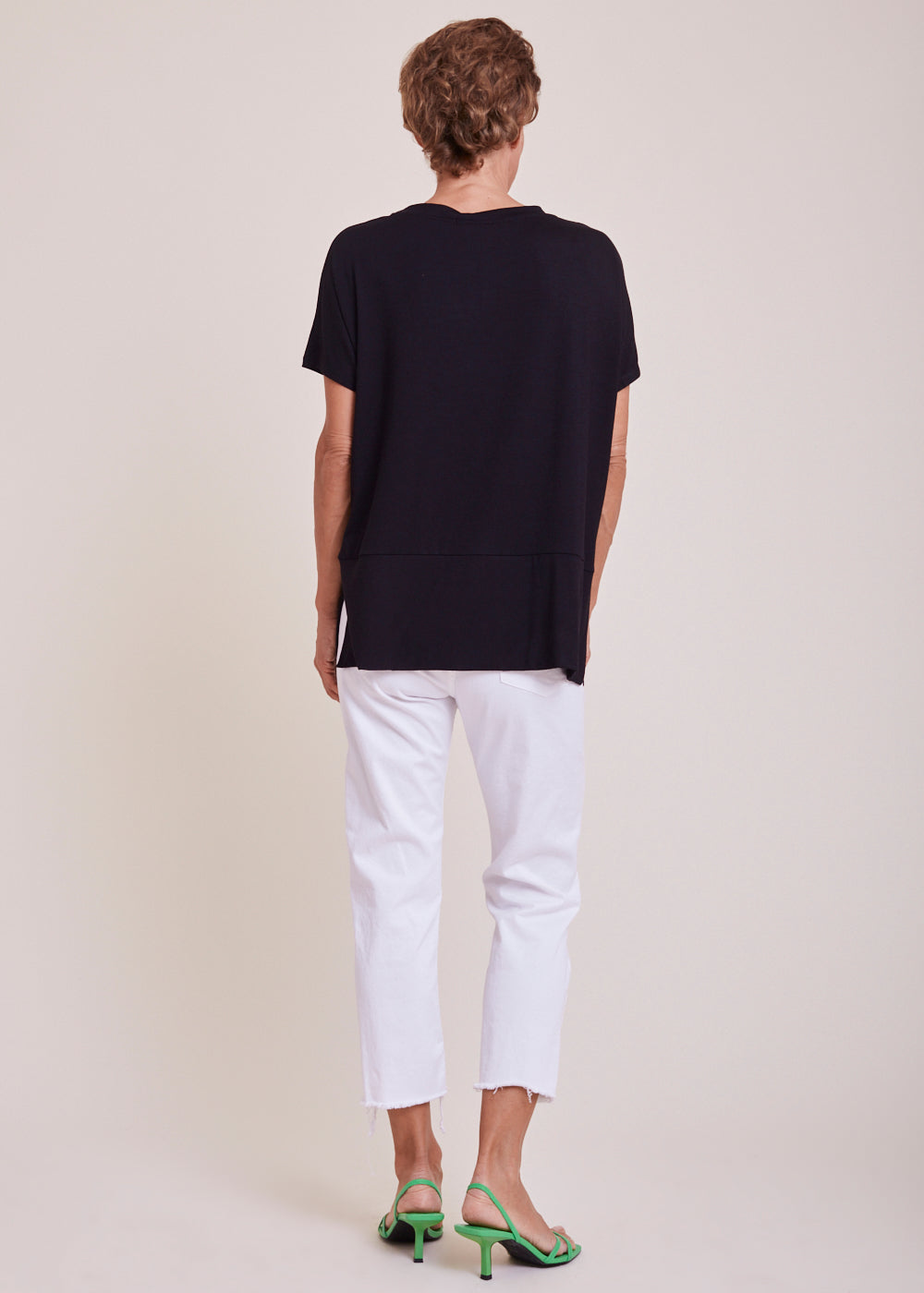 Bequemes Sommershirt in Nero. Das Shirt ist kastenförmig mit kurzen Ärmeln und seitlichen Schlitzen auf Hüfthöhe. Ein toller Kombinationsartikel aus wunderbar weichem Material, dass leicht um deinen Körper fällt.