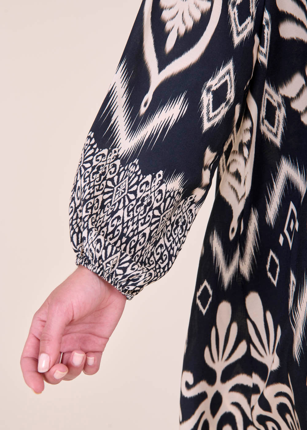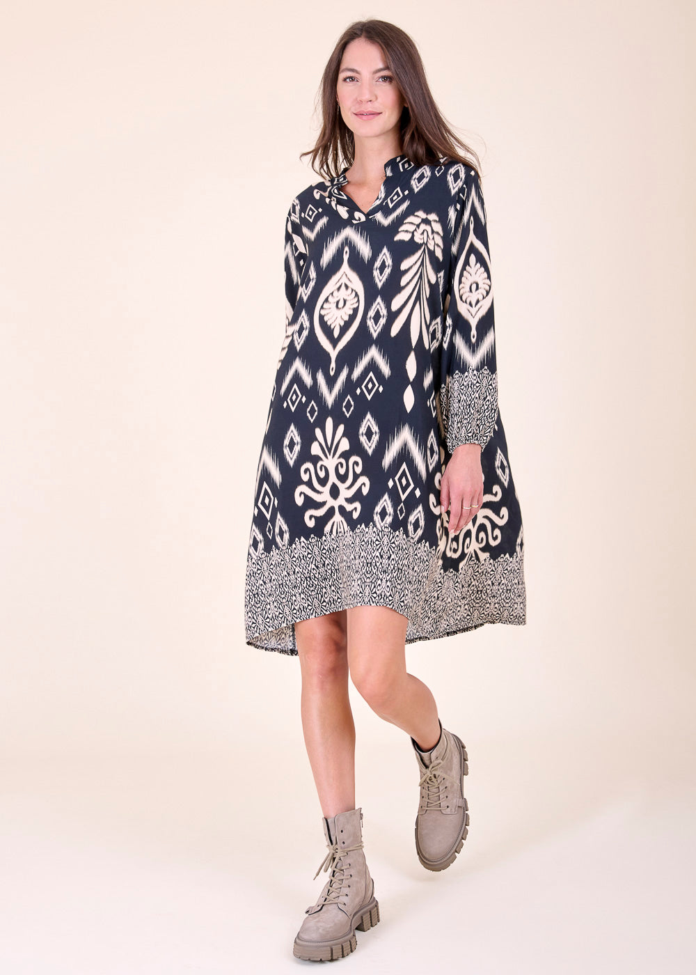 Dieses Kleid erstrahlt in gedeckten Farben und einem All-Over-Print-Muster. Der Volant-Rock sorgt für ein luftig-leichtes Tragegefühl. Das Kleid besitzt einen V-Ausschnitt und einen angedeuteten Kragen. Ein absoluter Hingucker.