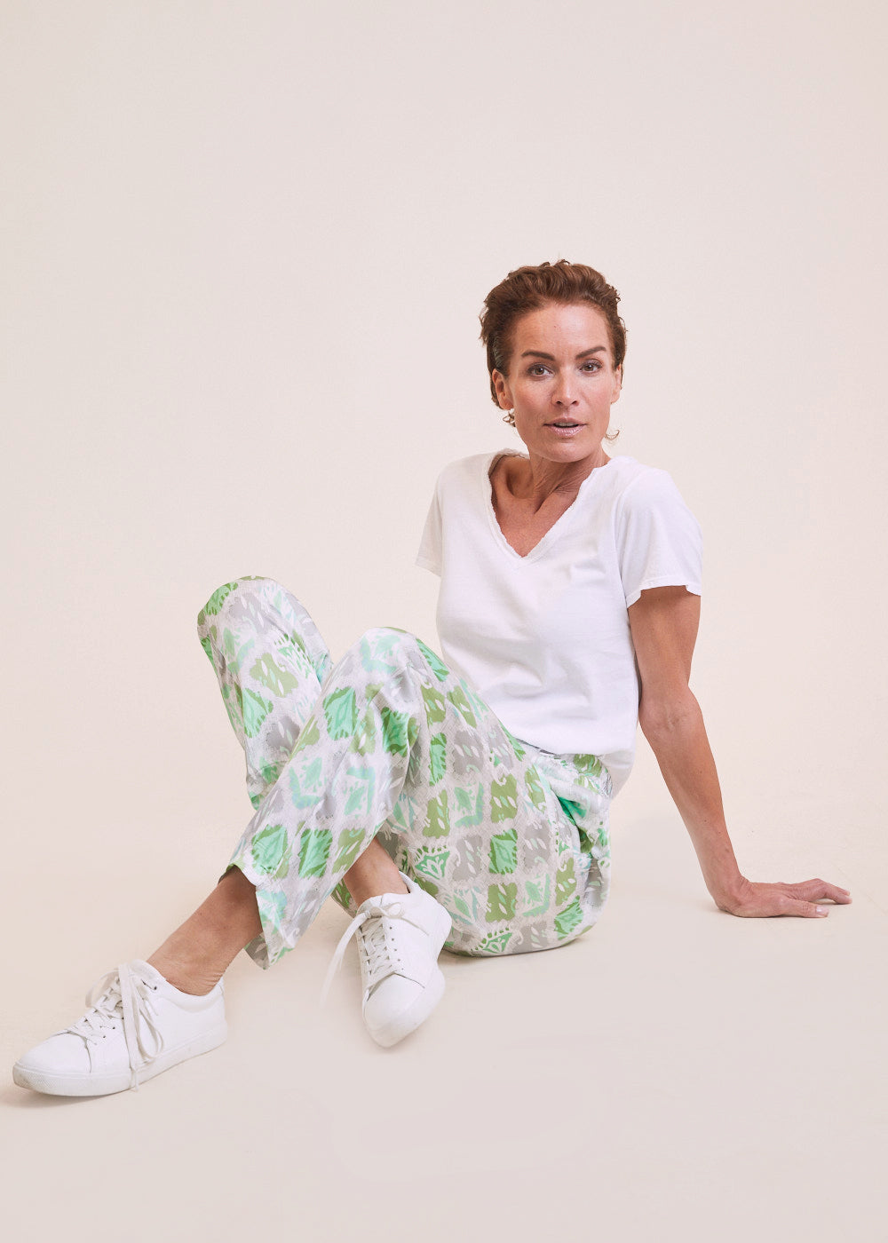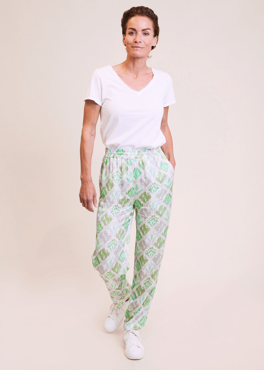 Lässig geschnittene Hose aus reiner Viskose in einem besonderen Print. Sie hat einen luftigen Tragekomfort durch ihr leicht fließendes Material. Durch ihren Gummibund sitzt diese Hose besonders bequem auf den Hüften. Sie hat seitliche Eingriffstaschen und lang geschnittene Beine. Die perfekte Hose für die heißen Tage. Kombiniere diesen Artikel gerne mit einem weißen Shirt oder einer schmaleren Bluse.