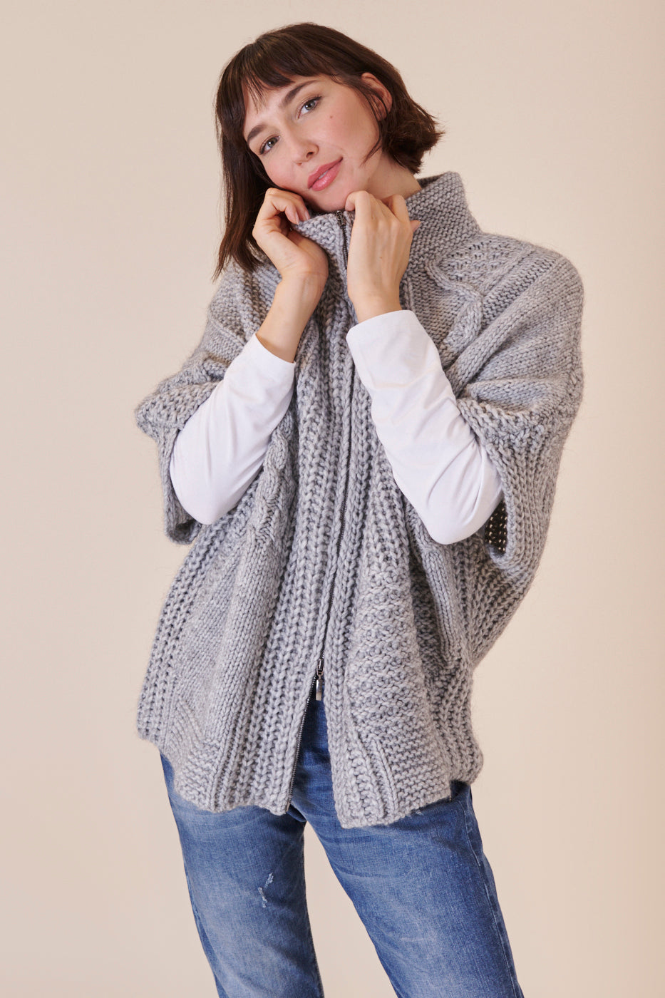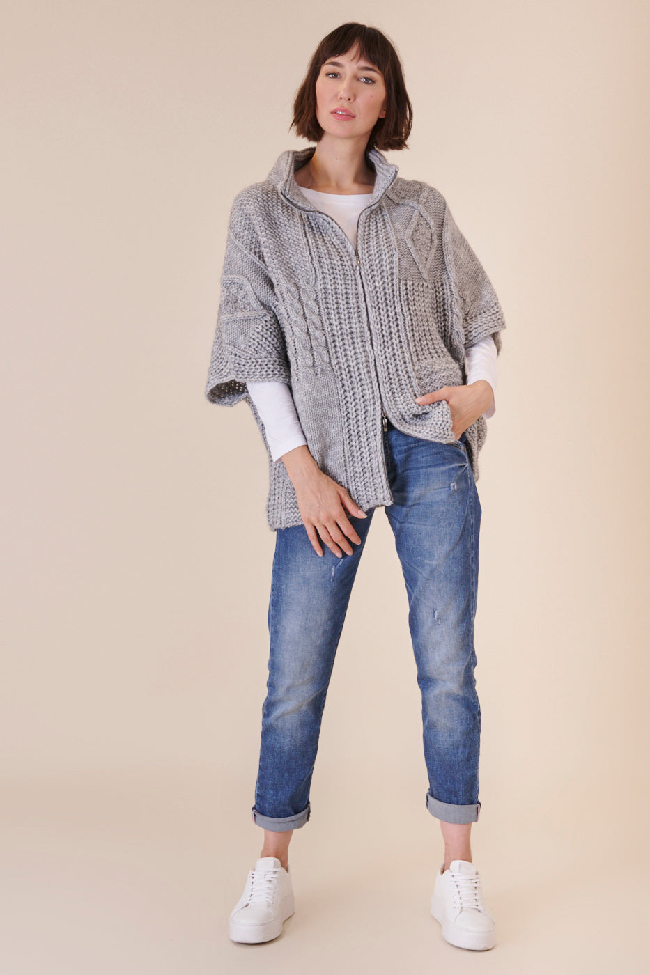 Unser geliebtes Strickcape mit kurzen Armen ist der perfekte Begleiter zum drüber werfen. Durch sein Unifarbenes Design lässt er sich wunderbar kombinieren und macht dabei noch eine richtig gute Figur. Mit diesem extravaganten Strickstück sind wir für alle Fashion-Fälle gewappnet.