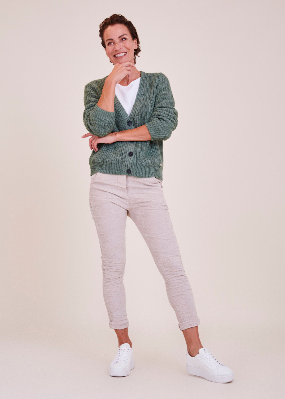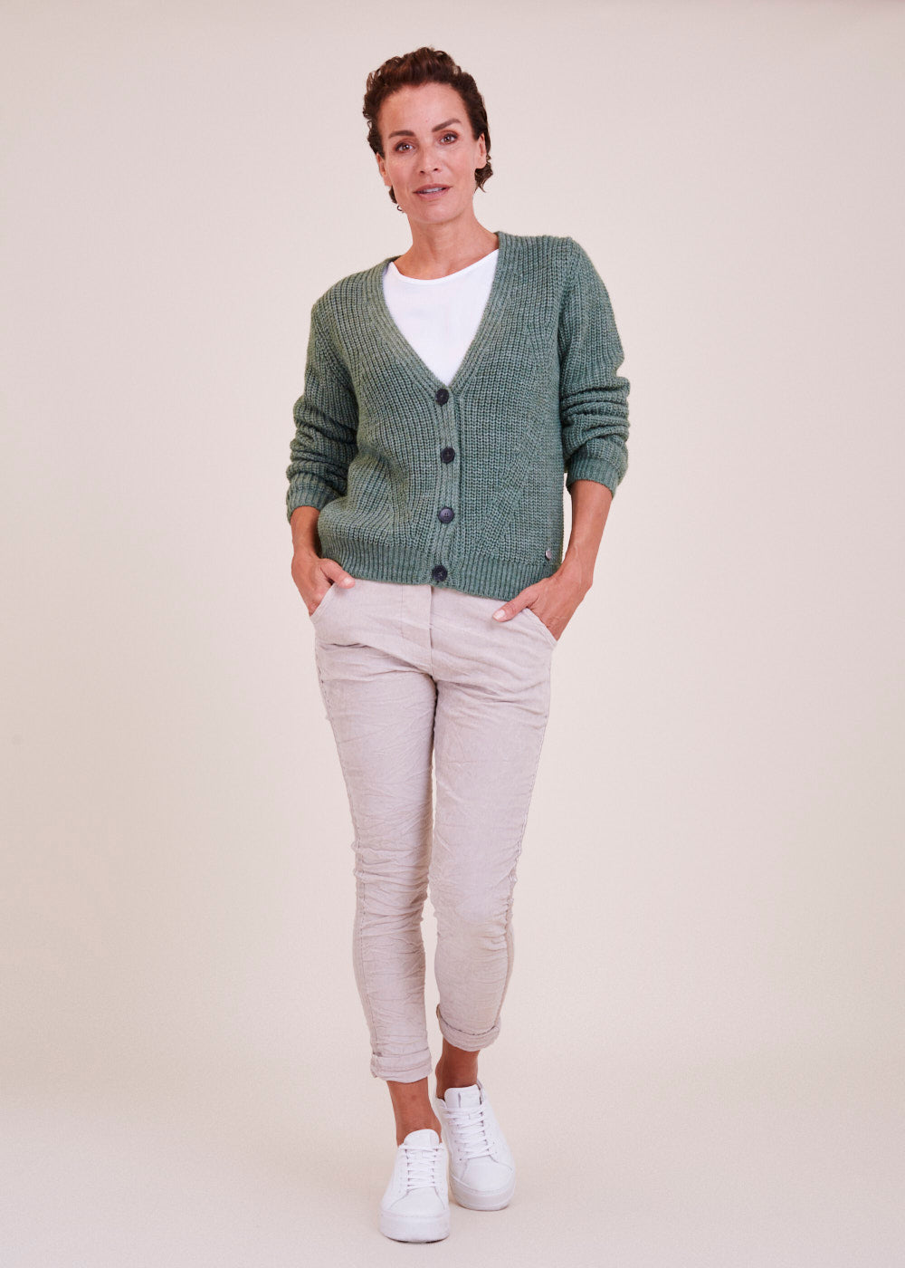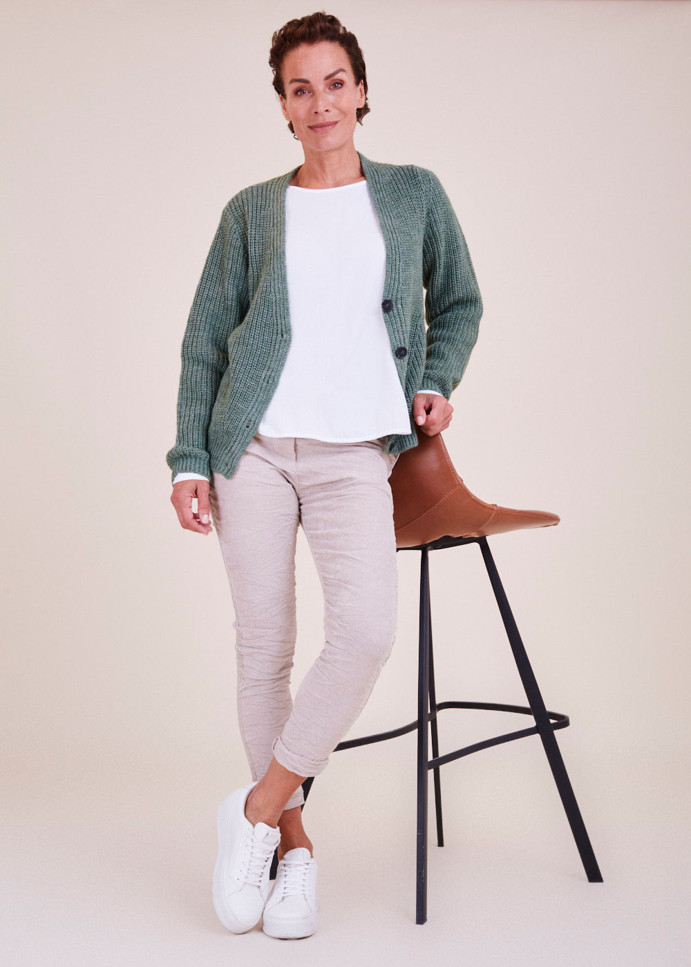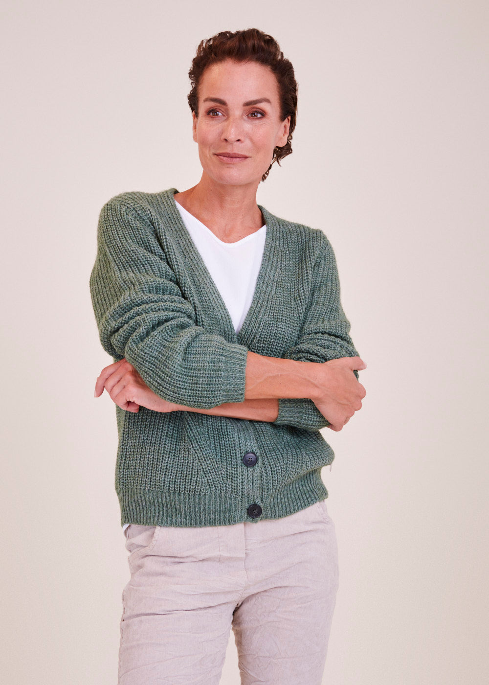 Kurz und kastenförmig geschnittene Strickjacke mit langen Armen in einem großartigen Grün Ton. Sie hat ein Rippenbündchen an den Ärmeln und am Saum. Durch die vier besonderen Frontknöpfe lässt sich diese Jacke wunderbar geschlossen tragen. Kuschelig weicher Tragekomfort mit absoluter Wohlfühlgarantie.
