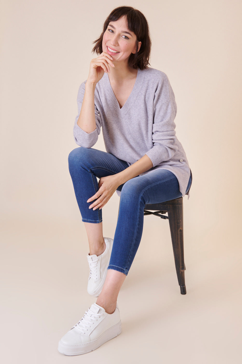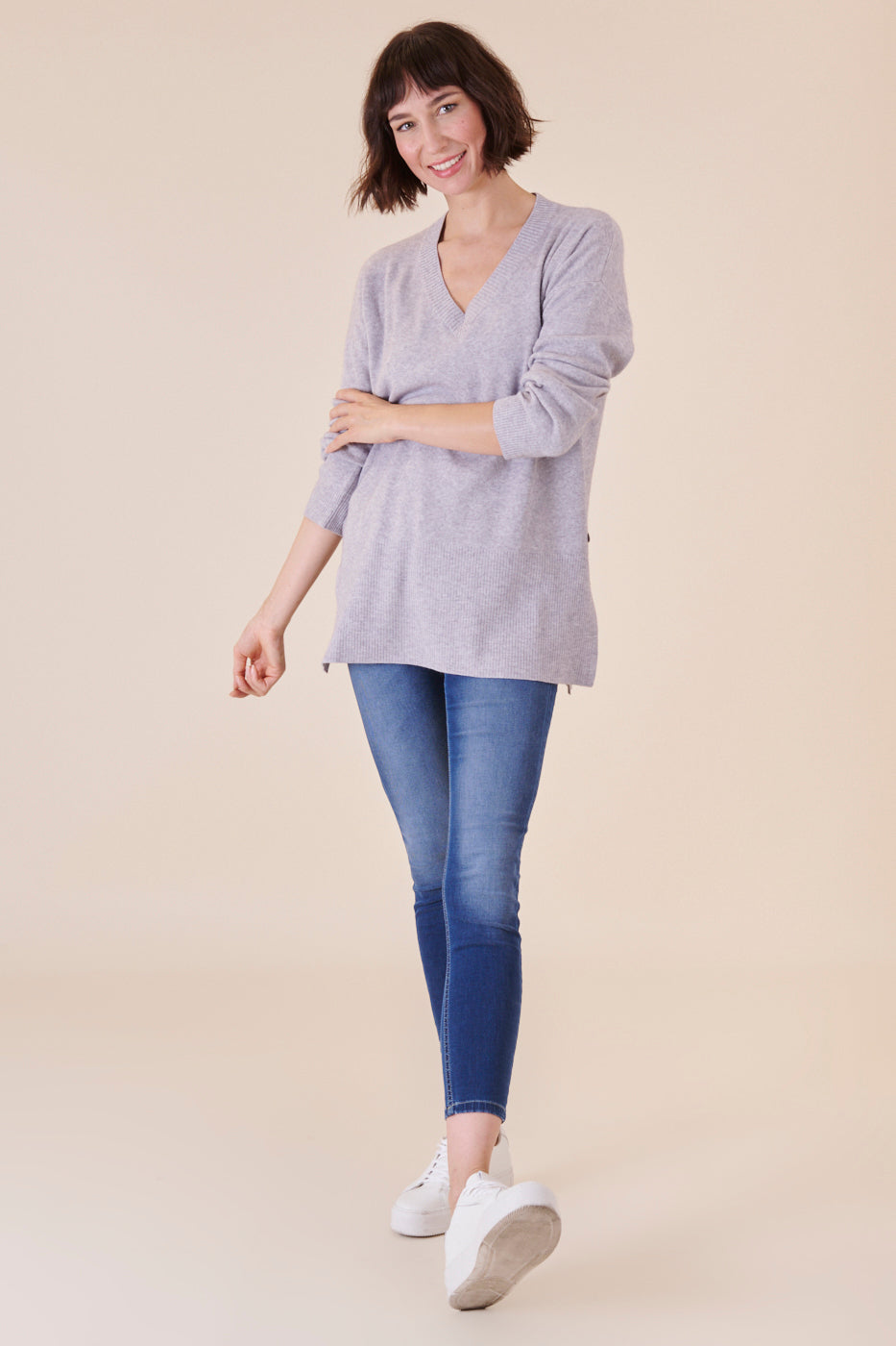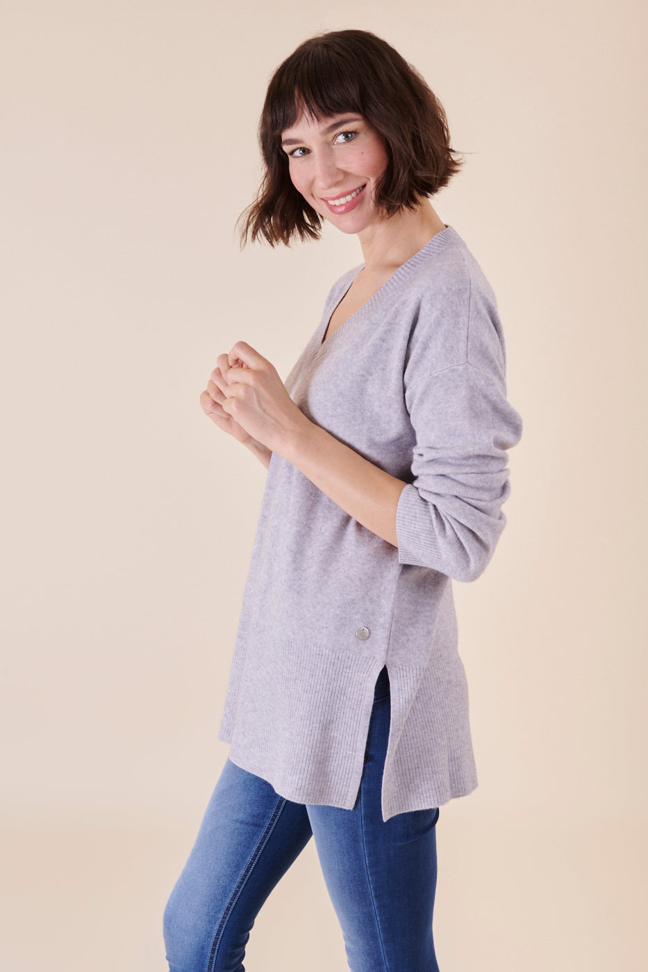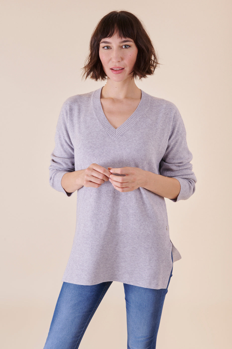 Kastenförmig und länger geschnittener V-Ausschnitt Pullover aus unserem Kuschelgarn. Er hat besondere Rippendetails am Saum und am Ärmel und hoch gehende seitliche Schlitze. Durch unser angenehmes Kuschelmaterial hat er einen großartigen Tragekomfort und punktet darüber hinaus mit seinem besonderen Design. Ein zeitloser Begleiter mit Stil.