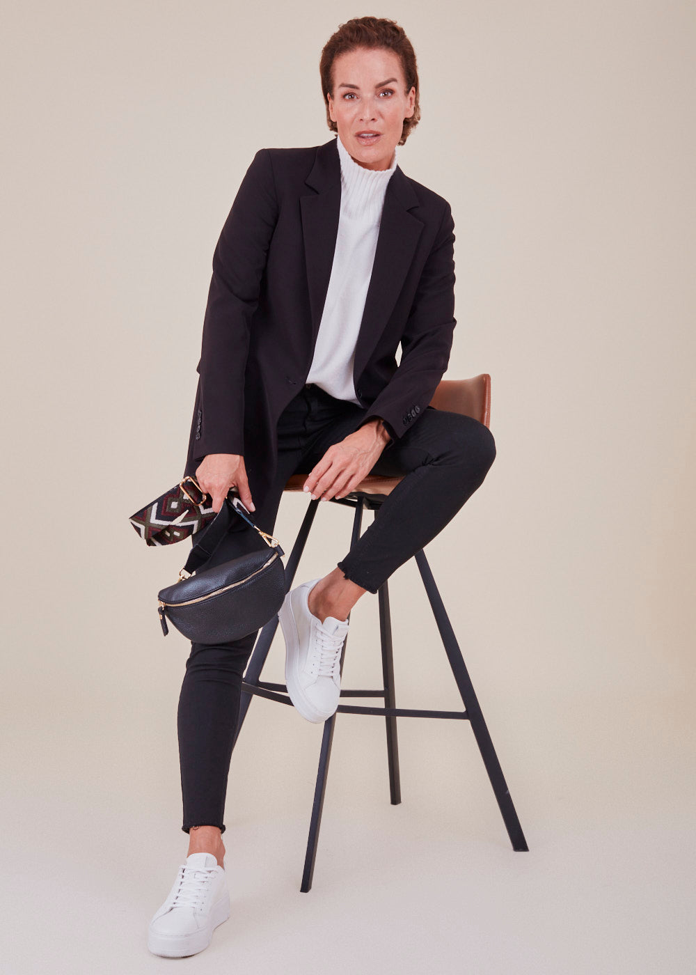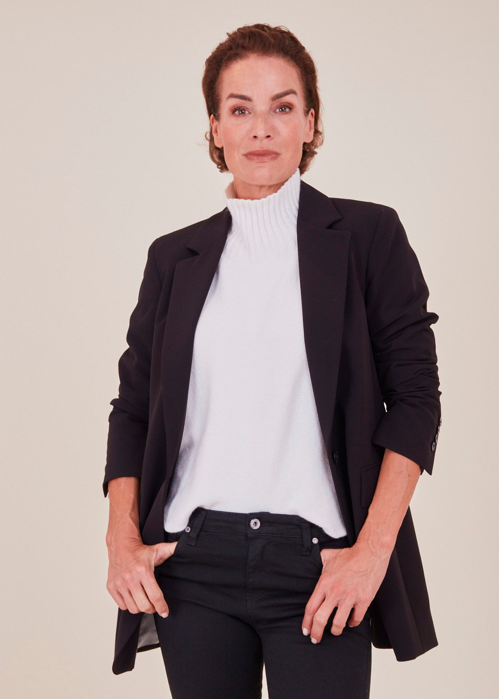 Länger geschnittener Blazer in einem großartigen Design. Er hat feine Pattentaschen und ist schließbar durch einen Knopf. Die gekonnte Schnittführung zaubert eine feminine Silhouette. Wer es etwas legerer mag, kann ein lässiges Outfit aus Jeans und Shirt mit der stylischen Jacke aufpeppen. Stilvoller und zeitloser Begleiter.
